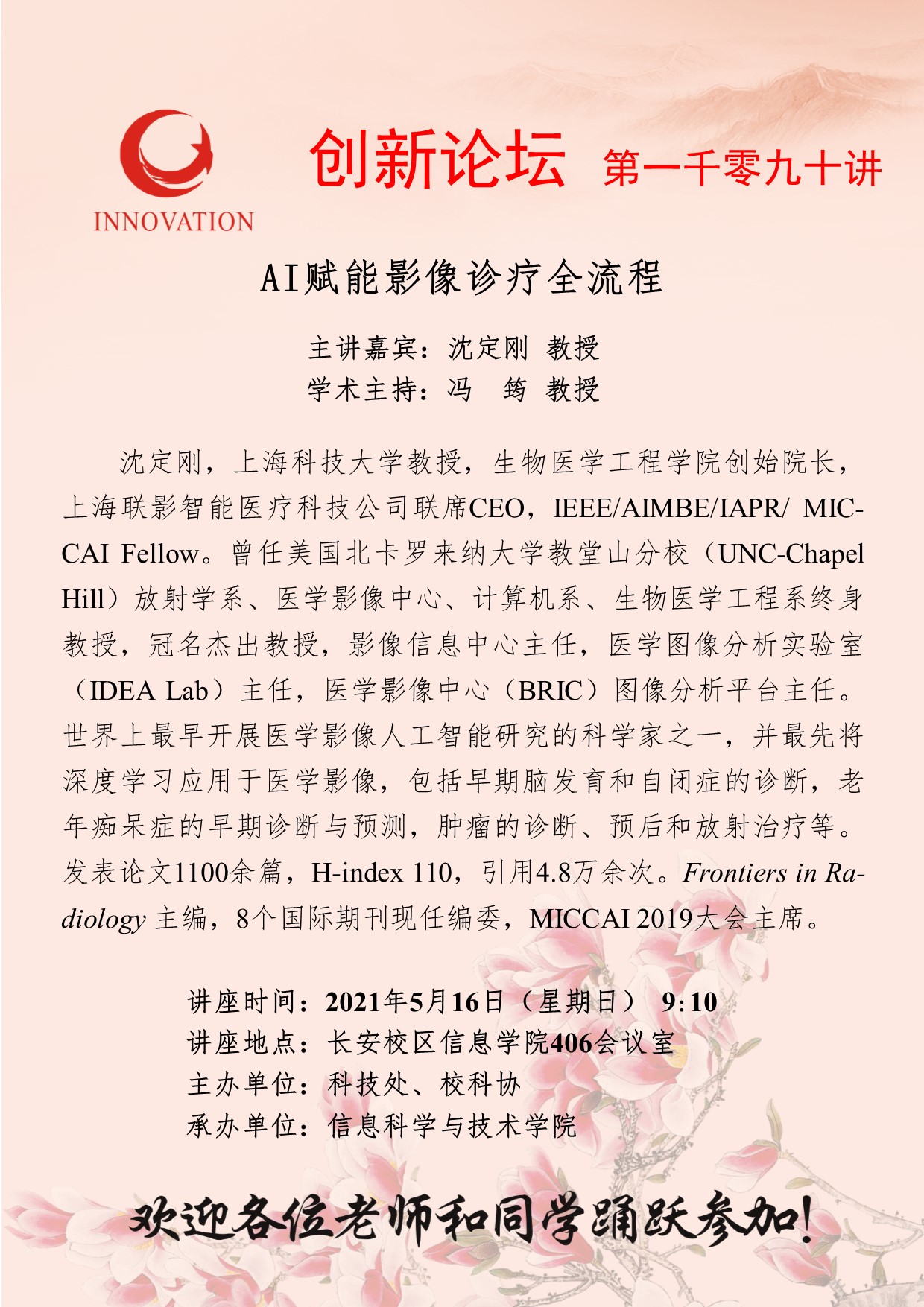 沈定刚 教授 乐鱼网页版页面登录创新论坛第一千零九十讲:AI赋能影像诊疗全流程 讲座时间 2021年5月16日(星期日) 9:10 讲座地点 长安校区信息学院406会议室 讲座人介绍 沈定刚 教授 讲座内容
