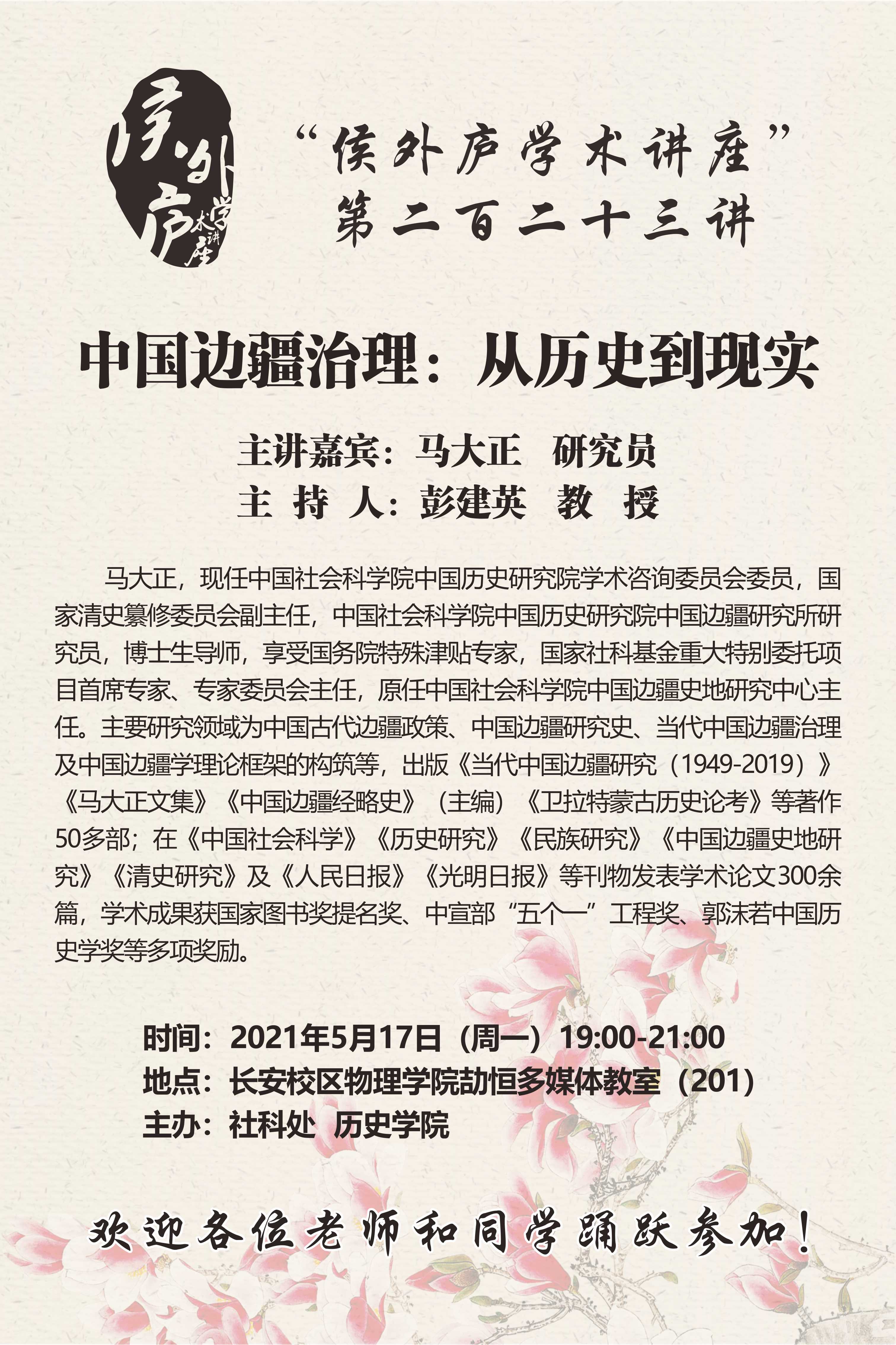 马大正 研究员 侯外庐学术讲座第二百二十三讲:中国边疆治理:从历史到现实 讲座时间 2021年5月17日(周一)19:00 讲座地点 长安校区物理学院劼恒多媒体教室(201) 讲座人介绍 马大正 研究员 讲座内容