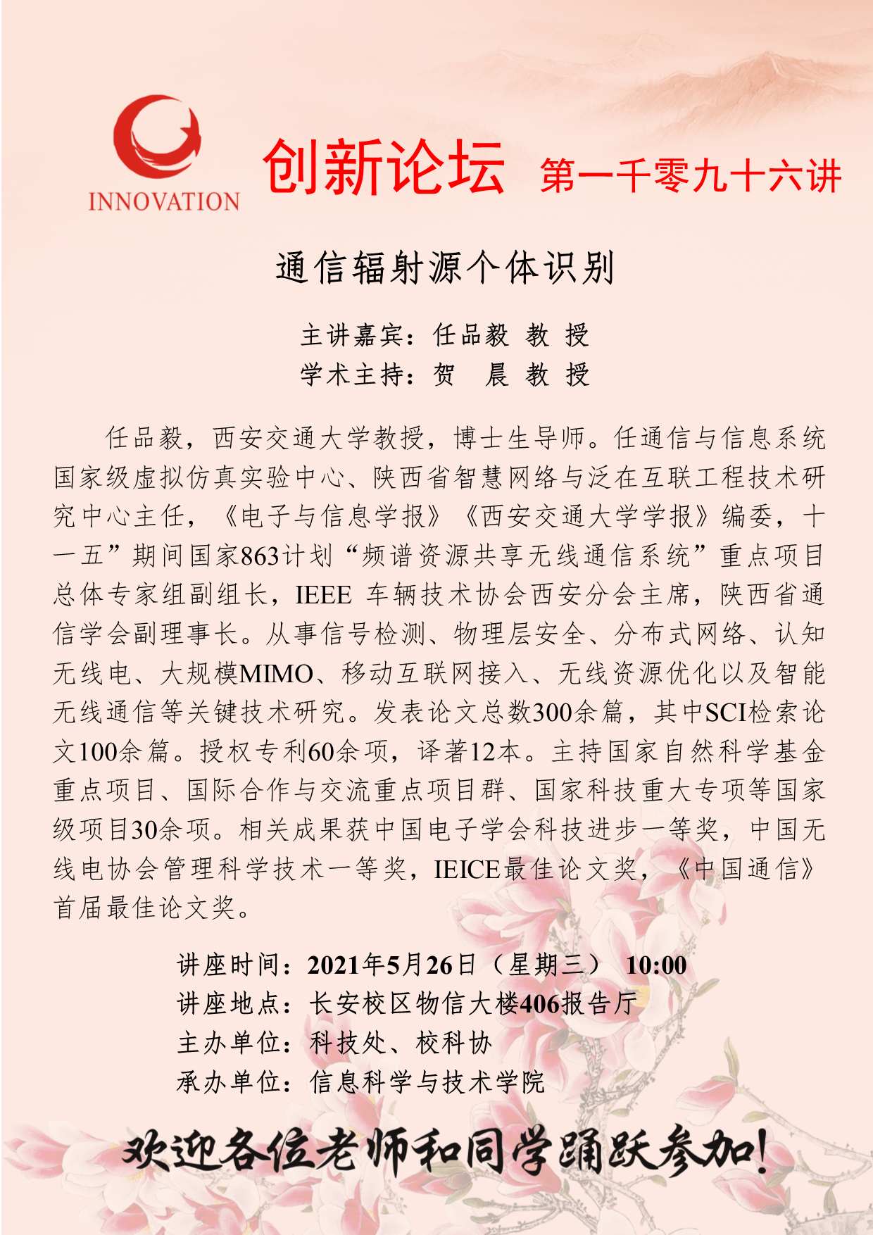 任品毅 教 授 乐鱼网页版页面登录创新论坛第一千零九十六讲:通信辐射源个体识别 讲座时间 2021年5月26日(星期三) 10:00 讲座地点 长安校区物信大楼406报告厅 讲座人介绍 任品毅 教 授 讲座内容
