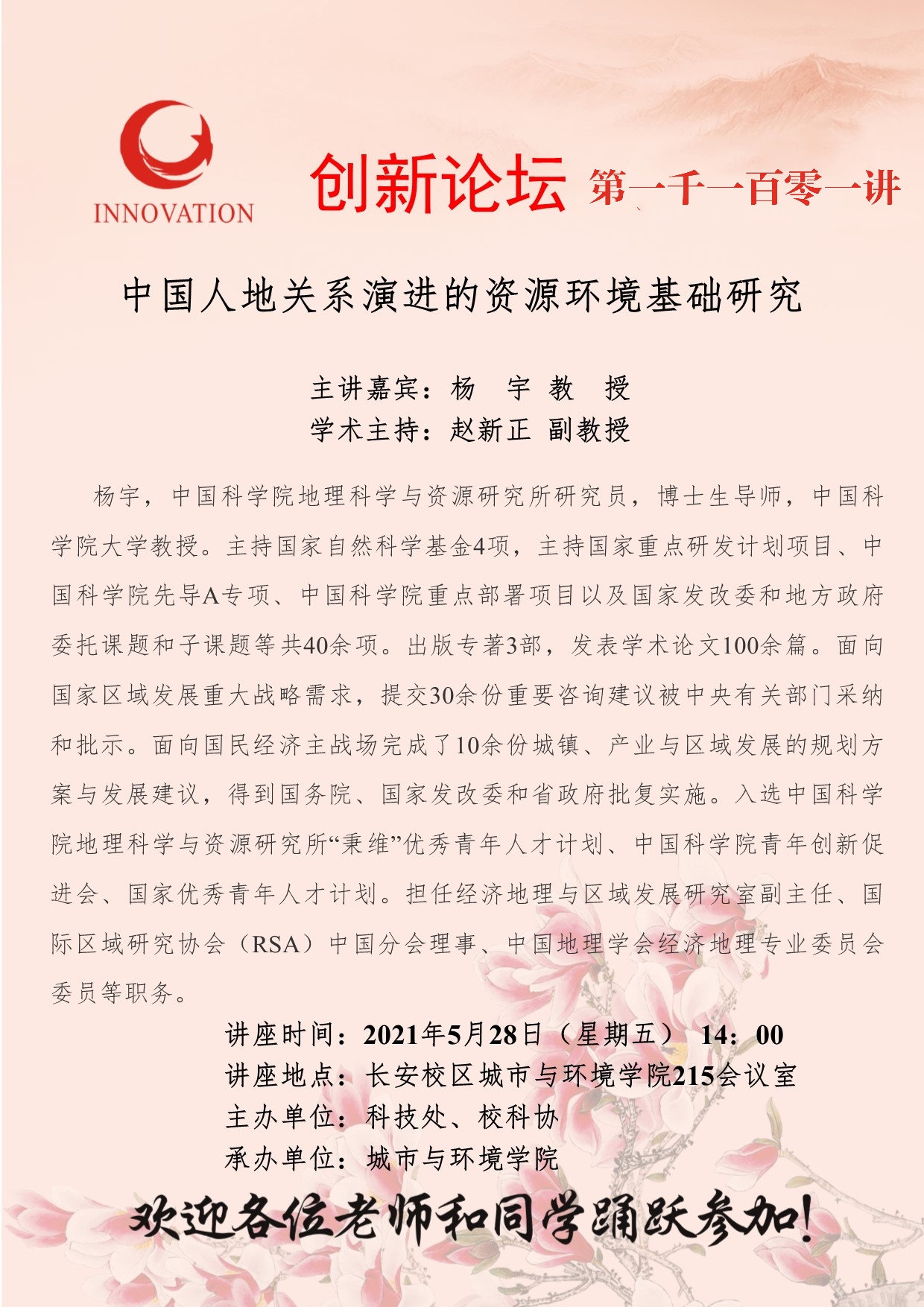 杨宇 教授 乐鱼网页版页面登录创新论坛第一千一百零一讲:中国人地关系演进的资源环境基础研究 讲座时间 2021年5月28日(星期五)14:00 讲座地点 长安校区城市与环境学院215会议室 讲座人介绍 杨宇 教授 讲座内容
