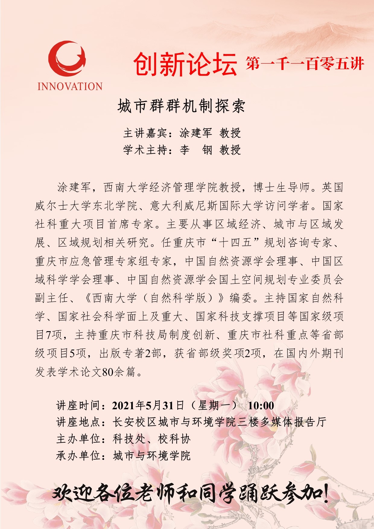 涂建军 教授 乐鱼网页版页面登录创新论坛第一千一百零五讲:城市群群机制探索 讲座时间 2021年5月31日(星期一) 10:00 讲座地点 长安校区城市与环境学院三楼多媒体报告厅 讲座人介绍 涂建军 教授 讲座内容
