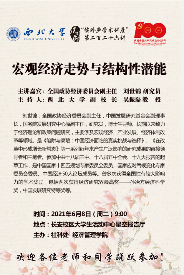 刘世锦 研究员 侯外庐学术讲座第二百二十六讲:宏观经济走势与结构性潜能 讲座时间 2021年6月8日(周二)9:00 讲座地点 长安校区大学生活动中心(星空报告厅) 讲座人介绍 刘世锦 研究员 讲座内容