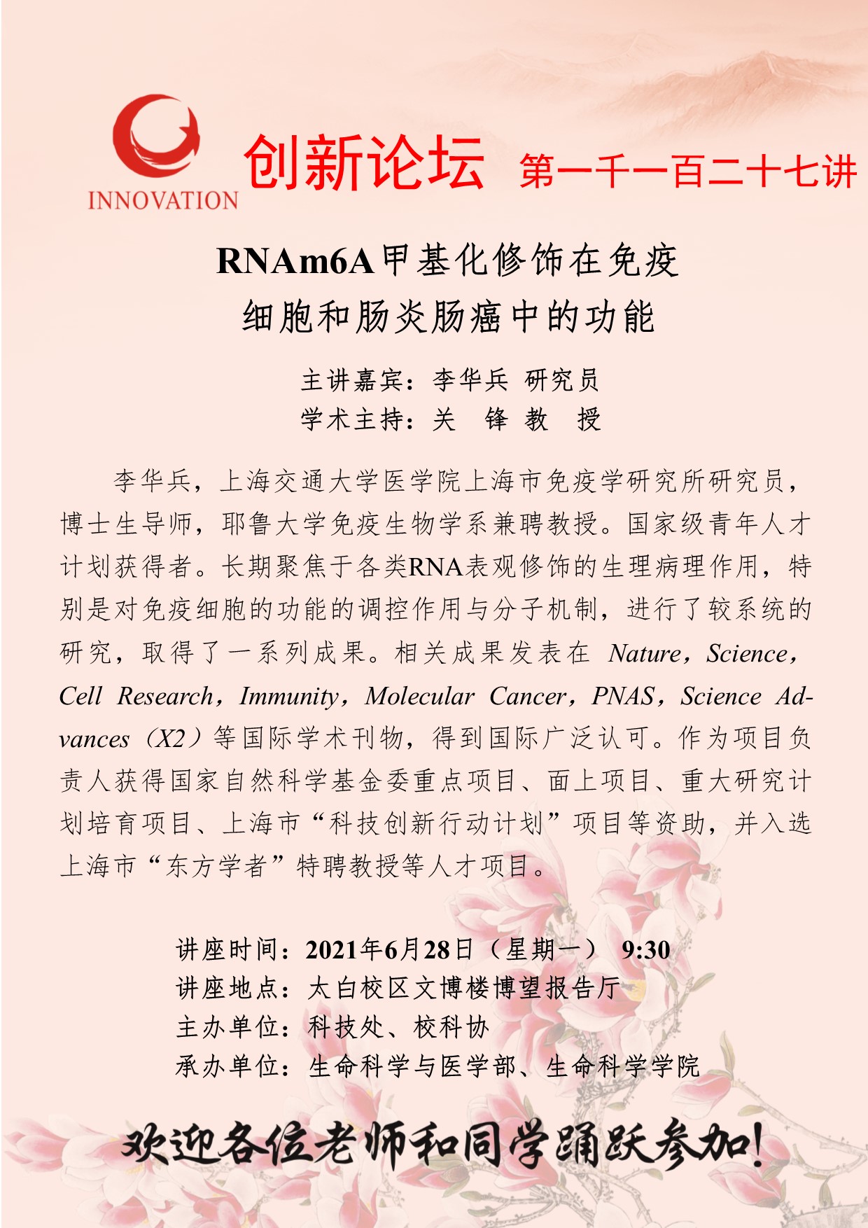 李华兵 研究员 乐鱼网页版页面登录创新论坛第一千一百二十七讲:RNAm6A甲基化修饰在免疫细胞和肠炎肠癌中的功能 讲座时间 2021年6月28日(星期一) 9:30 讲座地点 太白校区文博楼博望报告厅 讲座人介绍 李华兵 研究员 讲座内容