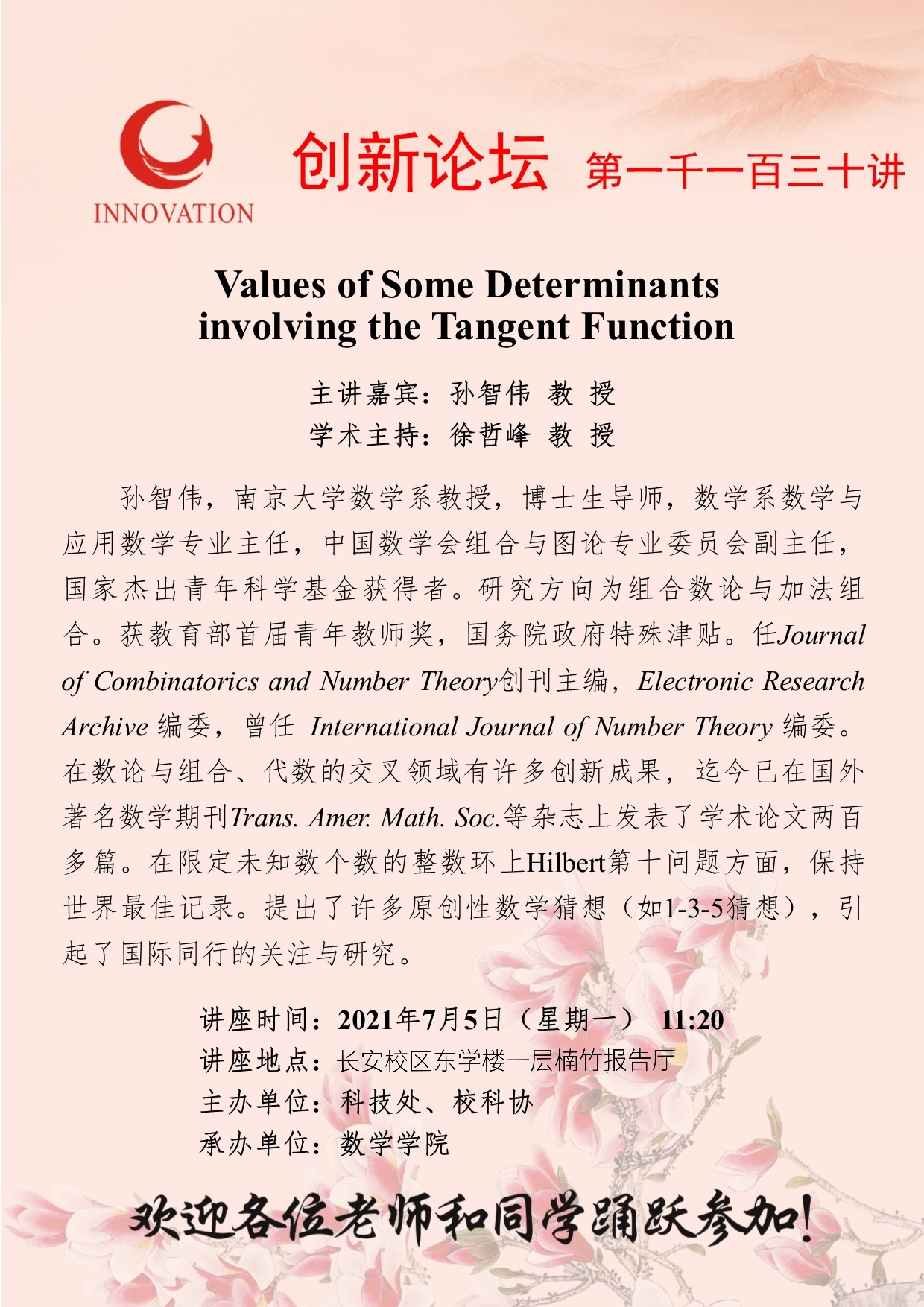 孙智伟 教 授 乐鱼网页版页面登录创新论坛第一千一百三十讲:Values of Some Determinants involving the Tangent Function 讲座时间 2021年7月5日(星期一) 11:20 讲座地点 长安校区东学楼一层楠竹报告厅 讲座人介绍 孙智伟 教 授 讲座内容