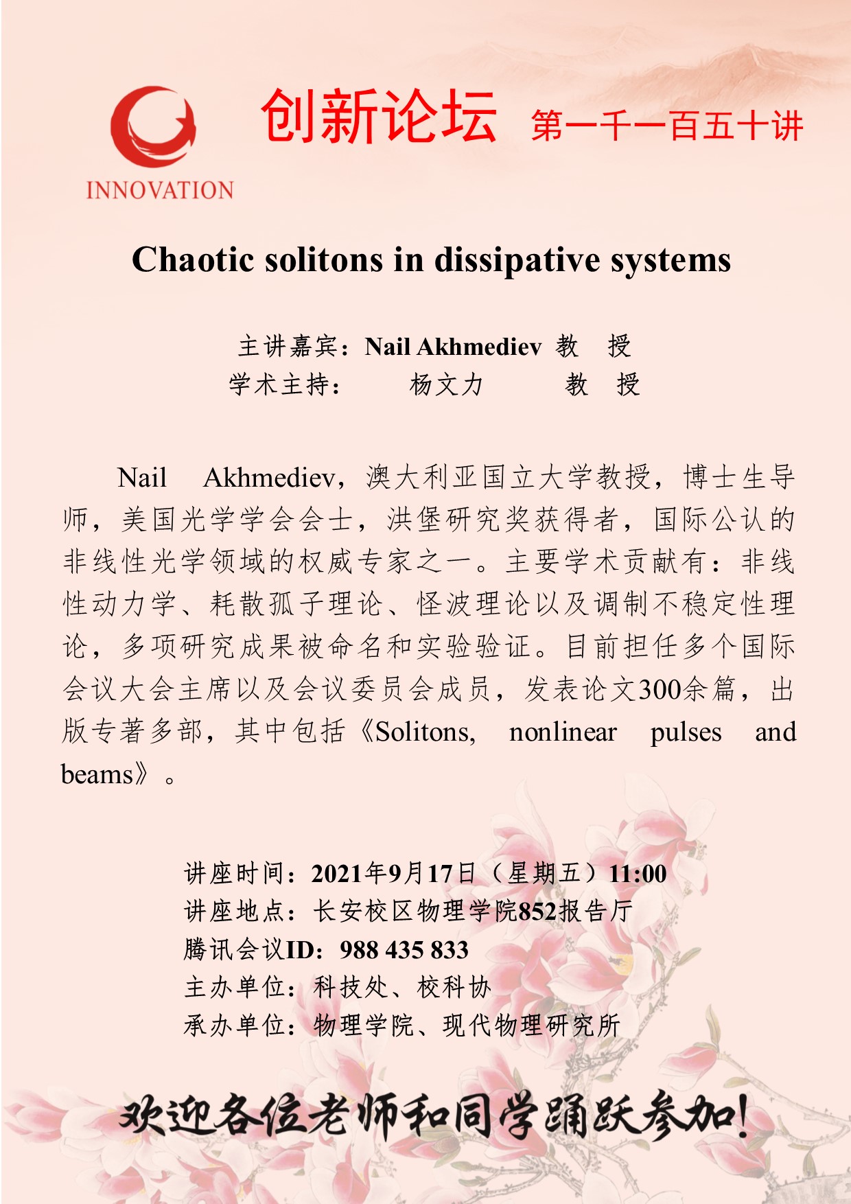 Nail Akhmediev 教授 乐鱼网页版页面登录创新论坛第一千一百五十讲:Chaotic solitons in dissipative systems 讲座时间 2021年9月17日(星期五)11:00 讲座地点 长安校区物理学院852报告厅 讲座人介绍 Nail Akhmediev 教授 讲座内容