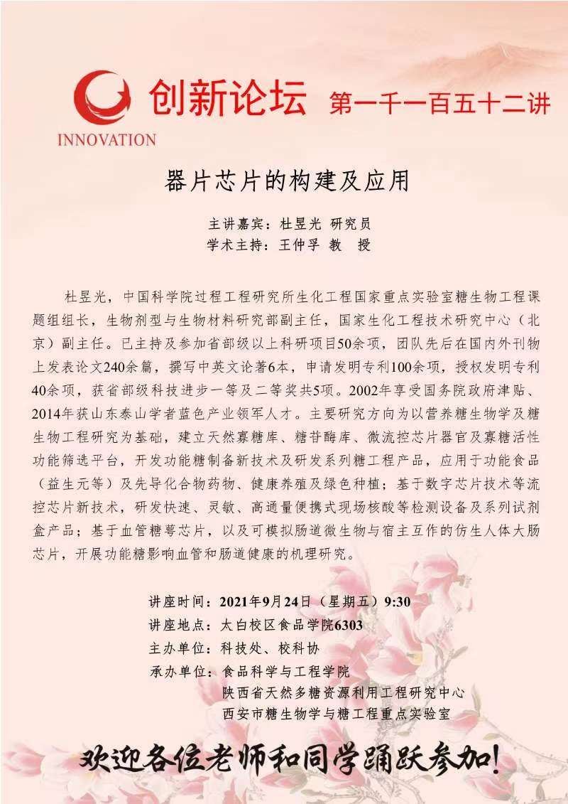 杜昱光 研究员 乐鱼网页版页面登录创新论坛第一千一百五十二讲:器片芯片的构建及应用 讲座时间 2021年9月24日(星期五)9:30 讲座地点 太白校区食品学院6303 讲座人介绍 杜昱光 研究员 讲座内容