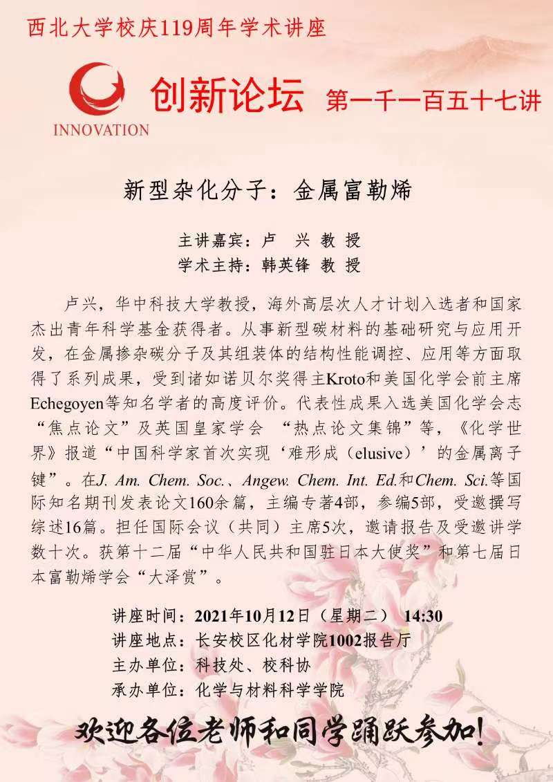 卢兴 教授 乐鱼网页版页面登录创新论坛第一千一百五十七讲暨校庆119周年学术讲座: 新型杂化分子:金属富勒烯 讲座时间 2021年10月12日(星期二)14:30 讲座地点 长安校区化材学院1002报告厅 讲座人介绍 卢兴 教授 讲座内容
