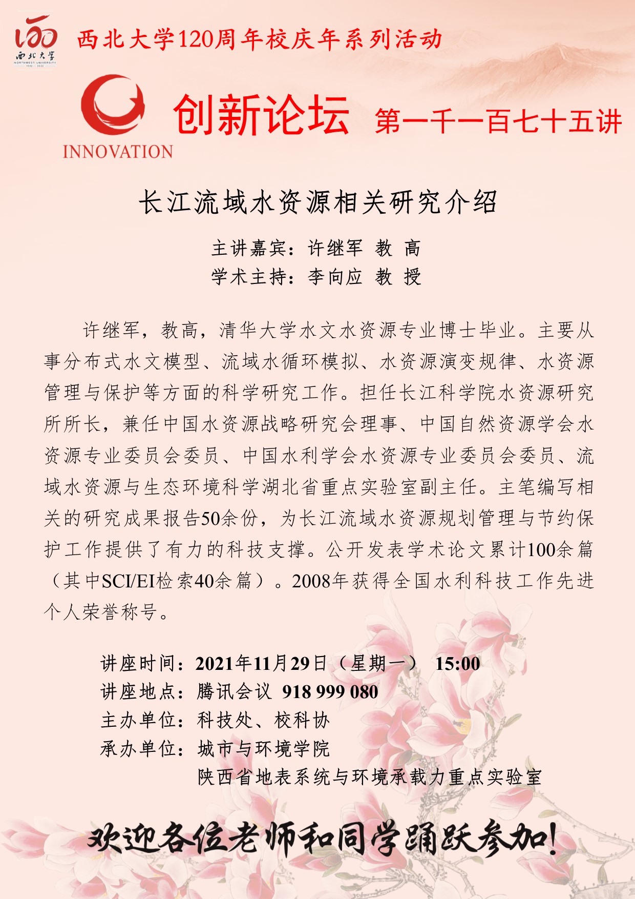许继军 教高 乐鱼网页版页面登录创新论坛第一千一百七十五讲暨120周年校庆年系列活动:长江流域水资源相关研究介绍 讲座时间 2021年11月29日(星期一) 15:00 讲座地点 腾讯会议:918999080 讲座人介绍 许继军 教高 讲座内容
