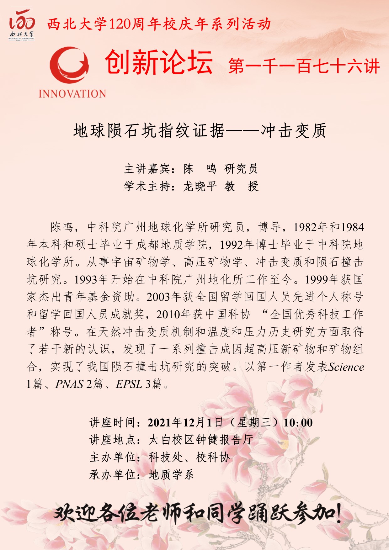 陈鸣 研究员 乐鱼网页版页面登录创新论坛第一千一百七十六讲暨120周年校庆年系列活动:地球陨石坑指纹证据——冲击变质 讲座时间 2021年12月1日(星期三)10:00 讲座地点 太白校区钟健报告厅 讲座人介绍 陈鸣 研究员 讲座内容