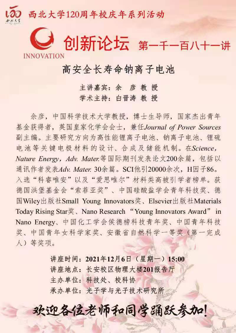 余彦 教授 乐鱼网页版页面登录创新论坛第一千一百八十一讲暨120周年校庆年系列活动:高安全长寿命钠离子电池 讲座时间 2021年12月6日(星期一)15:00 讲座地点 长安校区物理大楼201报告厅 讲座人介绍 余彦 教授 讲座内容