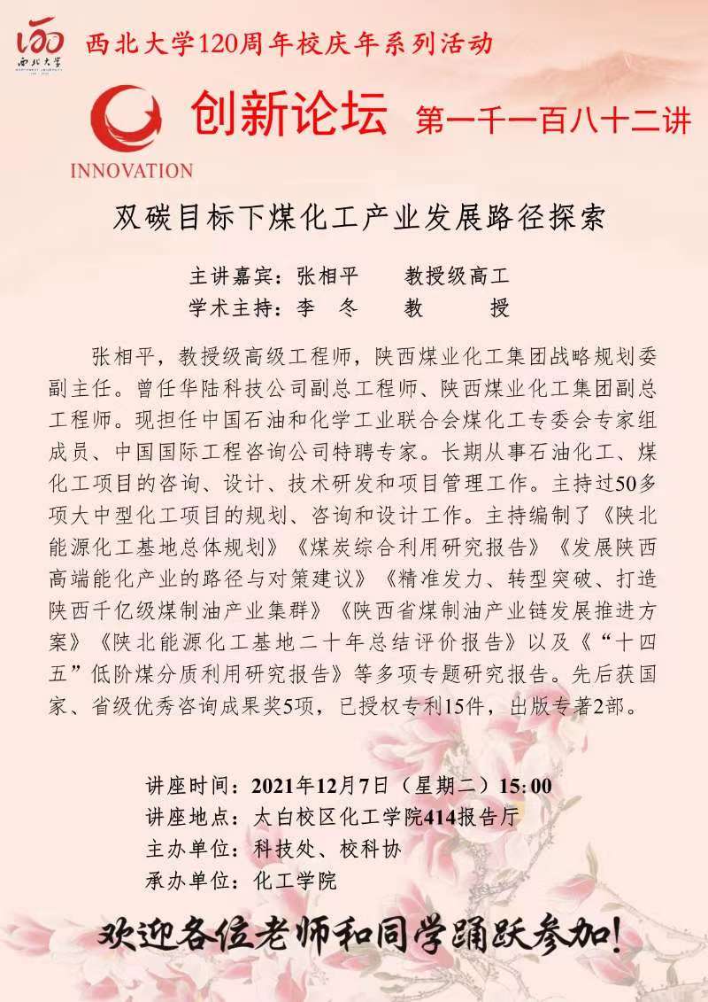 张相平 教授级高工 乐鱼网页版页面登录创新论坛第一千一百八十二讲暨120周年校庆年系列活动:双碳目标下煤化工产业发展路径探索 讲座时间 2021年12月7日(星期二)15:00 讲座地点 太白校区化工学院414报告厅 讲座人介绍 张相平 教授级高工 讲座内容