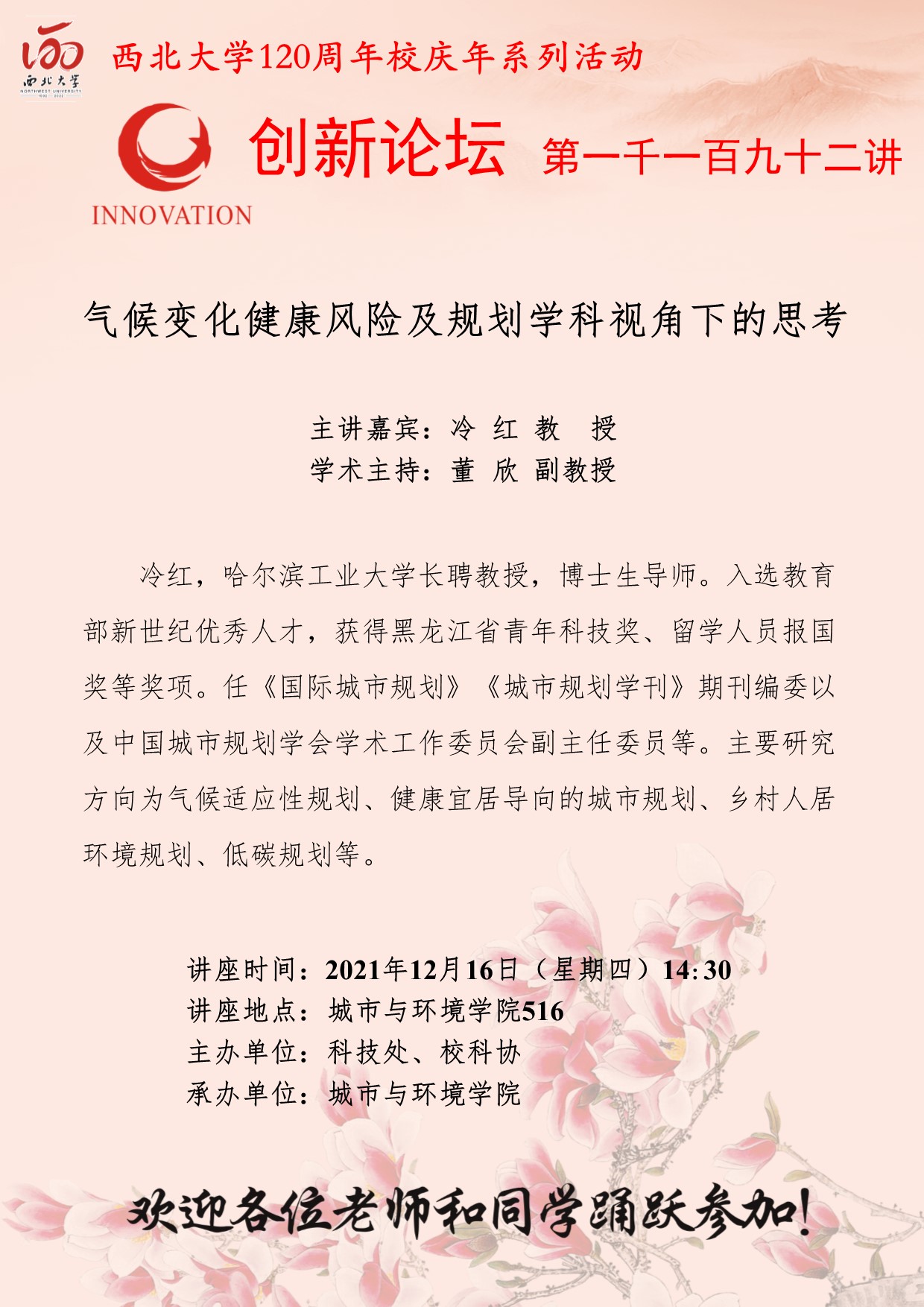 冷红 教授 乐鱼网页版页面登录创新论坛第一千一百九十二讲暨120周年校庆年系列活动:气候变化健康风险及规划学科视角下的思考 讲座时间 2021年12月16日(星期四)14:30 讲座地点 城市与环境学院516 讲座人介绍 冷红 教授 讲座内容