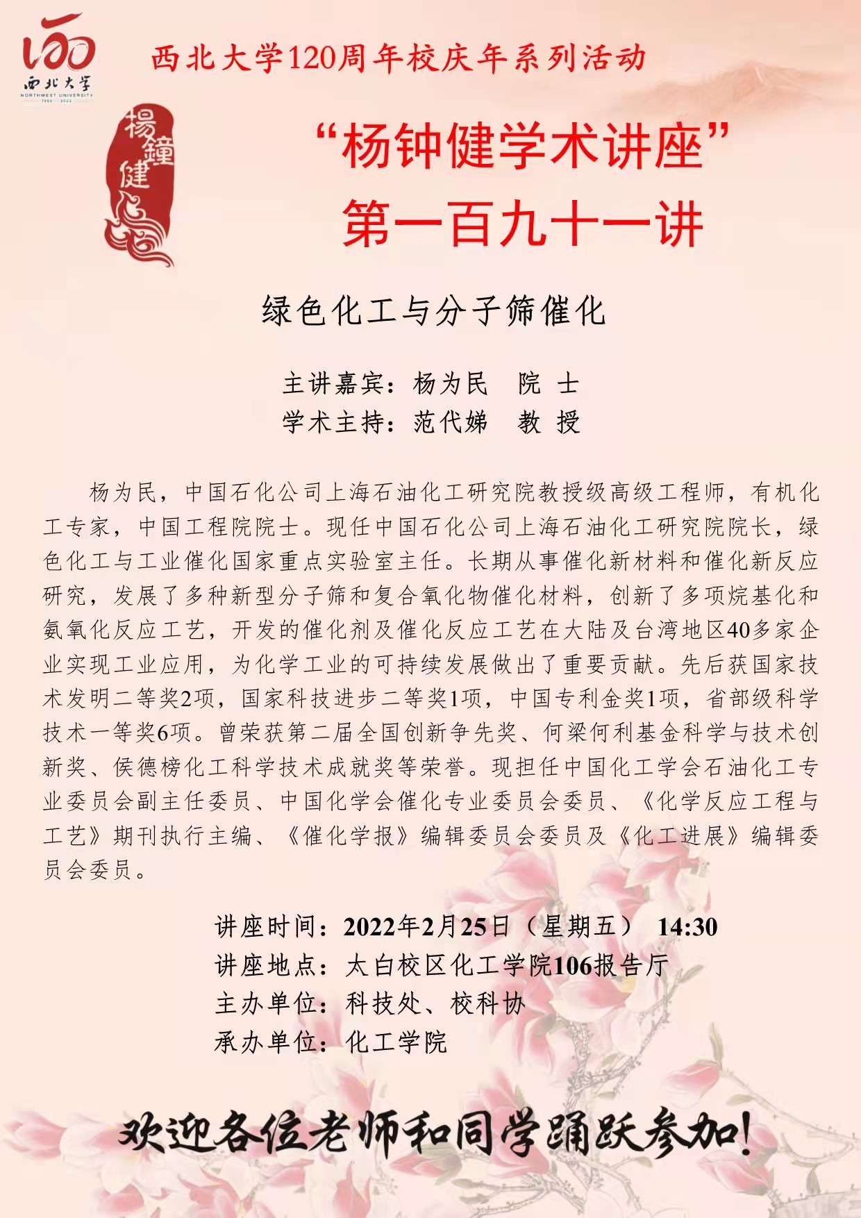 杨为民 院士 “杨钟健学术讲座”第一百九十一讲暨120周年校庆年系列活动:绿色化工与分子筛催化 讲座时间 2022年2月25日(星期五)14:30 讲座地点 太白校区化工学院106报告厅 讲座人介绍 杨为民 院士 讲座内容
