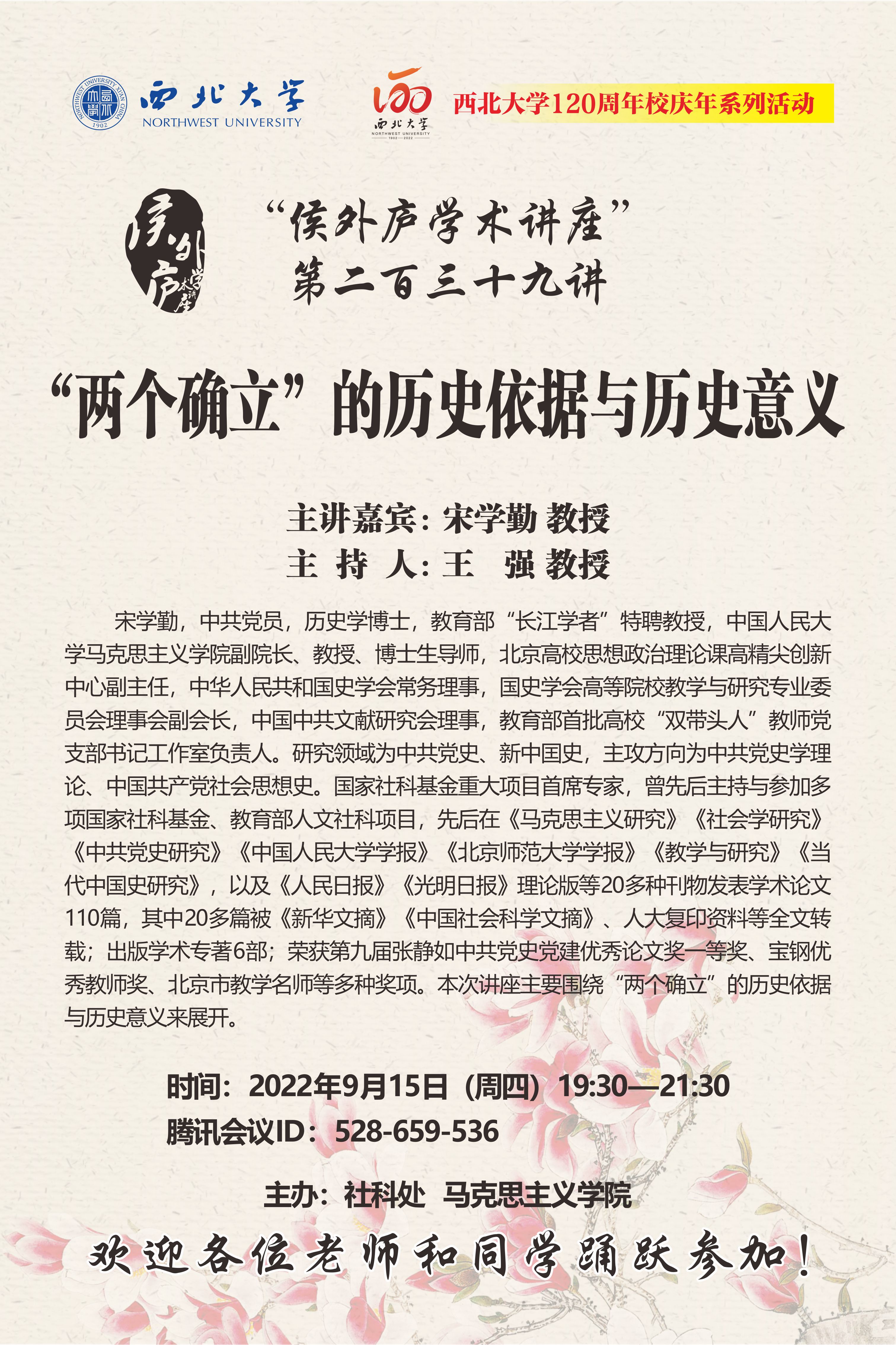 宋学勤 教授 侯外庐学术讲座第二百三十九讲暨120周年校庆年系列活动:“两个确立”的历史依据与历史意义 讲座时间 2022年9月15日(周四)19:30 讲座地点 腾讯会议ID:528-659-536 讲座人介绍 宋学勤 教授 讲座内容