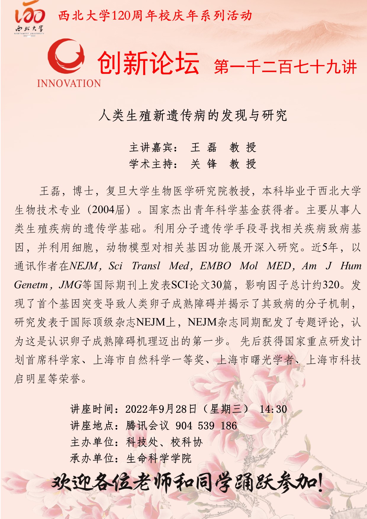 王 磊 教 授 乐鱼网页版页面登录创新论坛第一千二百七十九讲暨120周年校庆年系列活动:人类生殖新遗传病的发现与研究 讲座时间 2022年9月28日(星期三) 14:30 讲座地点 腾讯会议 904 539 186 讲座人介绍 王 磊 教 授 讲座内容