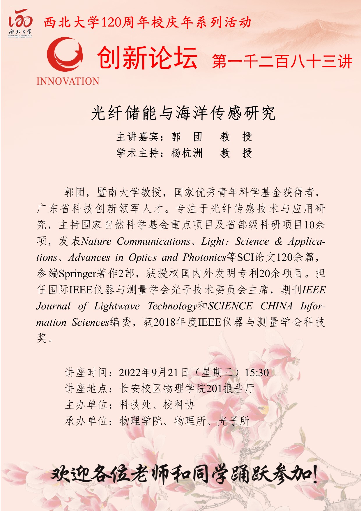 郭团 教授 乐鱼网页版页面登录创新论坛第一千二百八十三讲暨120周年校庆年系列活动::光纤储能与海洋传感研究 讲座时间 2022年9月21日(星期三) 15:30 讲座地点 物理学院201报告厅 讲座人介绍 郭团 教授 讲座内容