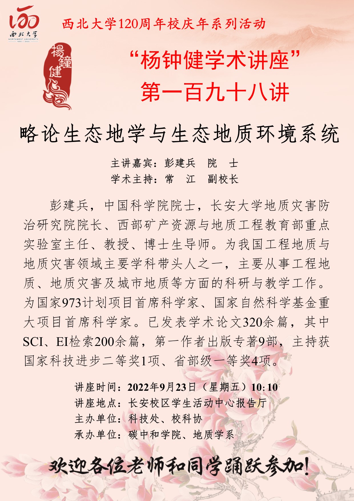 彭建兵 院士 “杨钟健学术讲座”第一百九十八讲暨120周年校庆年系列活动:略论生态地学与生态地质环境系统 讲座时间 2022年9月23日(星期五)10:10 讲座地点 长安校区学生活动中心报告厅 讲座人介绍 彭建兵 院士 讲座内容