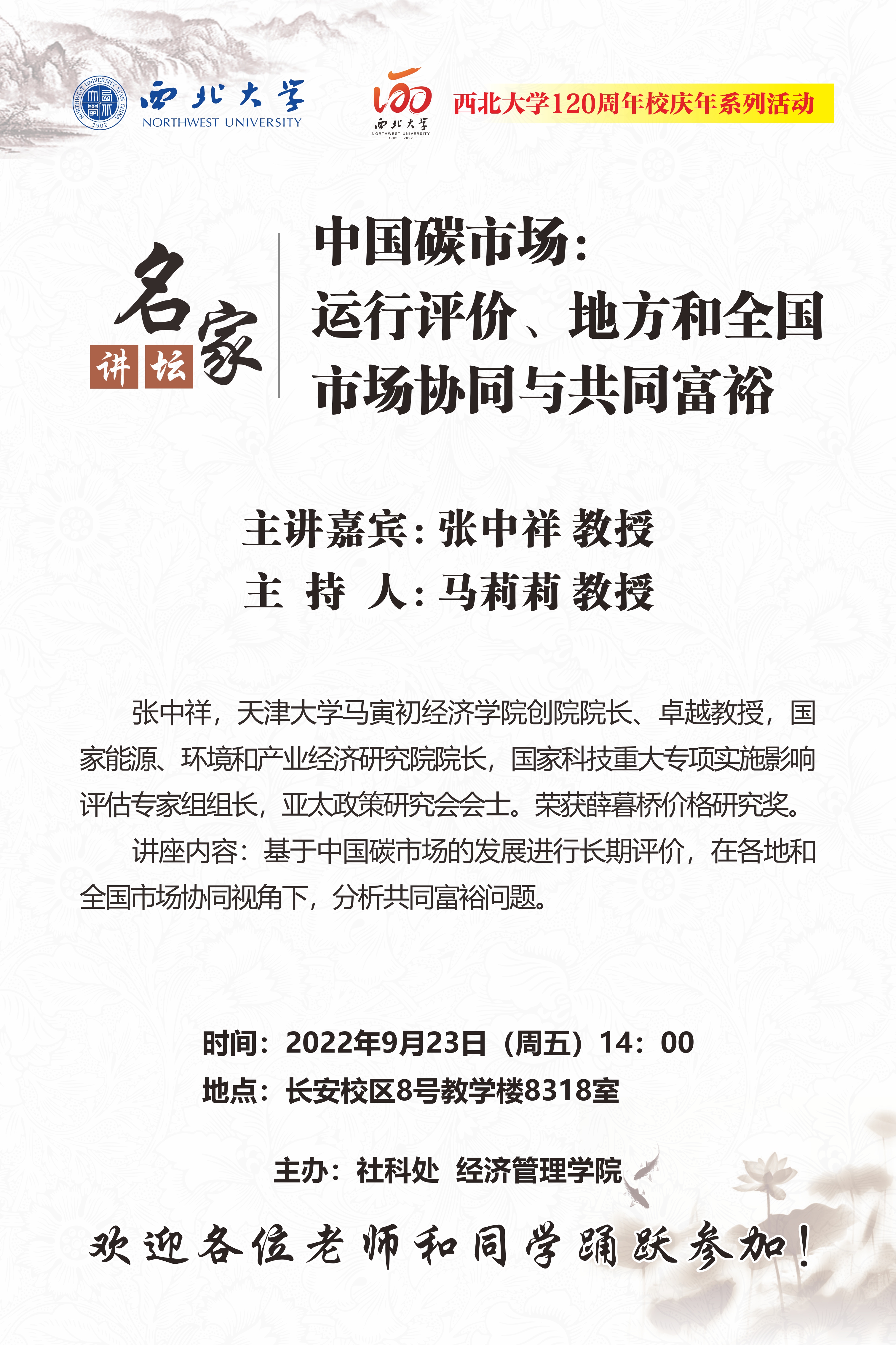 张中祥 教授 名家讲坛暨120周年校庆年系列活动:中国碳市场:运行评价、地方和全国市场协同与共同富裕 讲座时间 2022年9月23日(周五)14:00 讲座地点 长安校区8号教学楼8318室 讲座人介绍 张中祥 教授 讲座内容