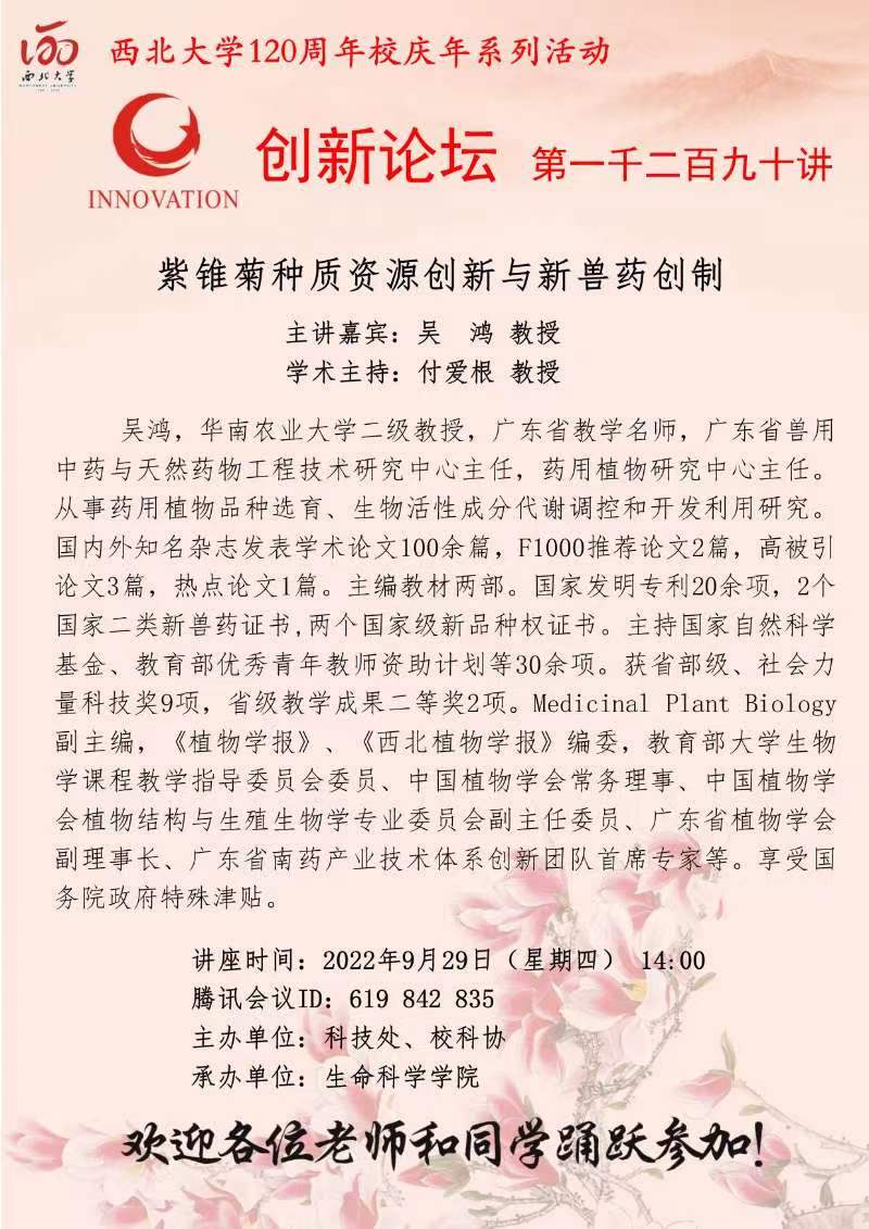 吴 鸿 教授 乐鱼网页版页面登录创新论坛第一千二百九十讲暨120周年校庆年系列活动: 紫锥菊种质资源创新与新兽药创制 讲座时间 2022年9月29日(星期四) 14:00 讲座地点 腾讯会议 619 842 835 讲座人介绍 吴 鸿 教授 讲座内容