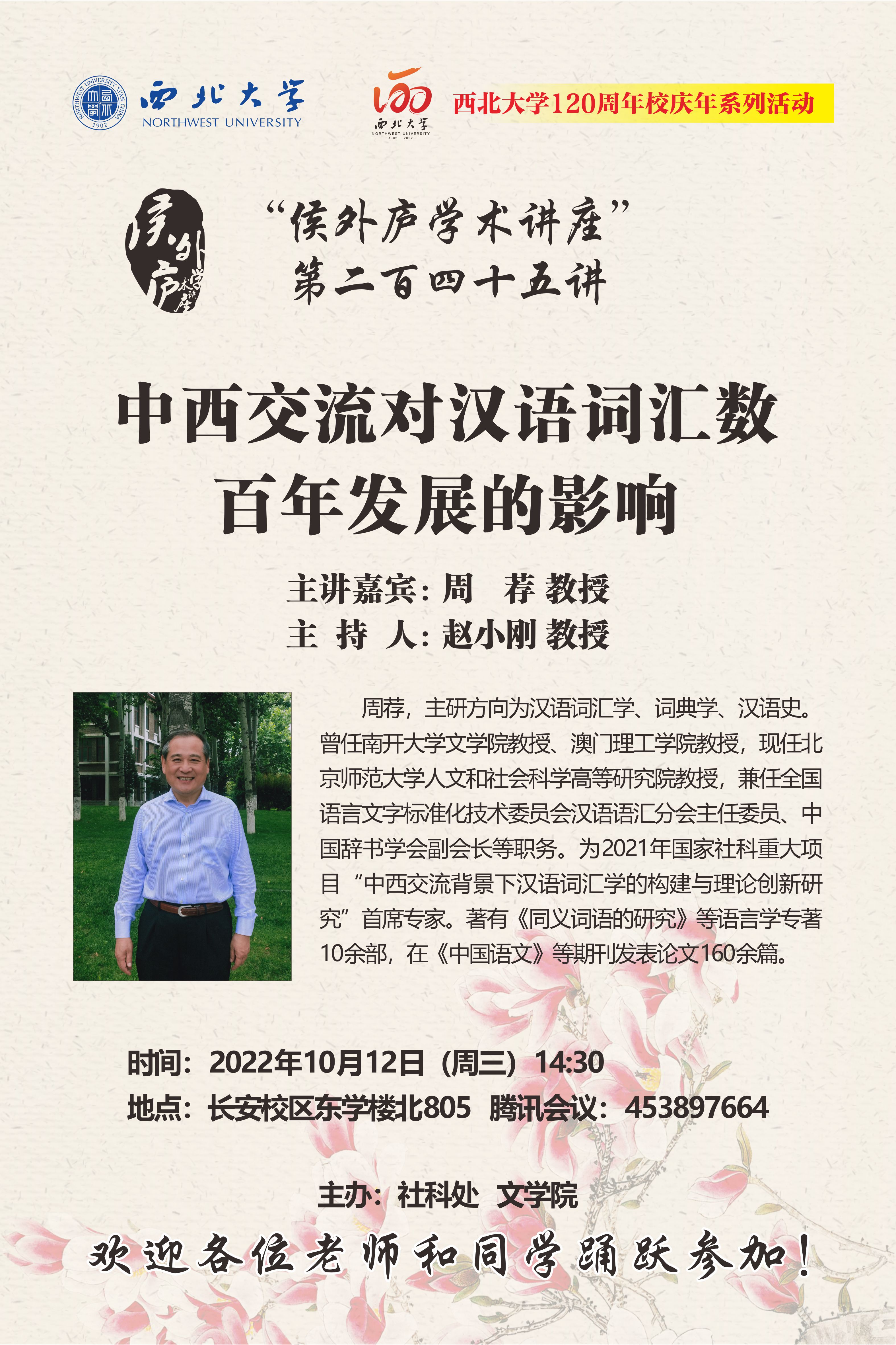 周荐 教授 侯外庐学术讲座第二百四十五讲暨120周年校庆年系列活动:中西交流对汉语词汇数百年发展的影响 讲座时间 2022年10月12日(周三)14:30 讲座地点 长安校区东学楼北805 讲座人介绍 周荐 教授 讲座内容