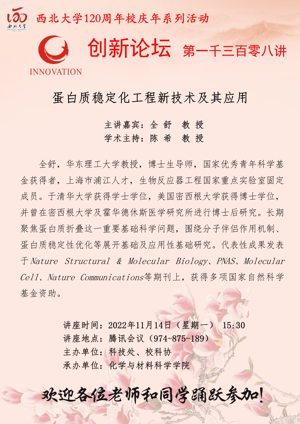 全舒 教授 乐鱼网页版页面登录创新论坛第一千三百零八讲暨120周年校庆年系列活动: 蛋白质稳定化工程新技术及其应用 讲座时间 2022年11月14日(星期一)15:30 讲座地点 腾讯会议(974 875 189) 讲座人介绍 全舒 教授 讲座内容