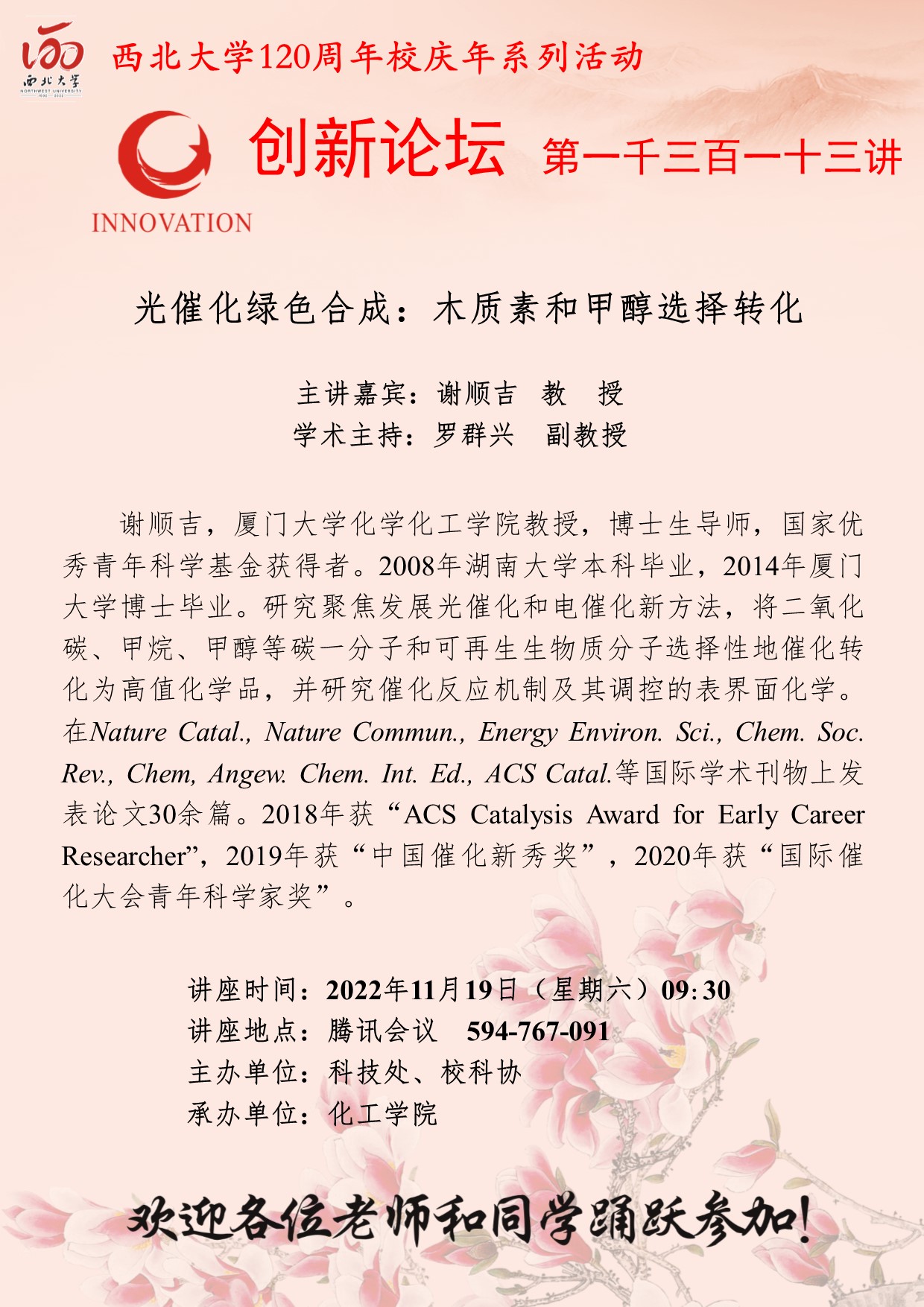 谢顺吉 教授 乐鱼网页版页面登录创新论坛第一千三百一十三讲暨120周年校庆年系列活动: 光催化绿色合成:木质素和甲醇选择转化 讲座时间 2022年11月19日(星期六)09:30 讲座地点 腾讯会议( 594-767-091) 讲座人介绍 谢顺吉 教授 讲座内容