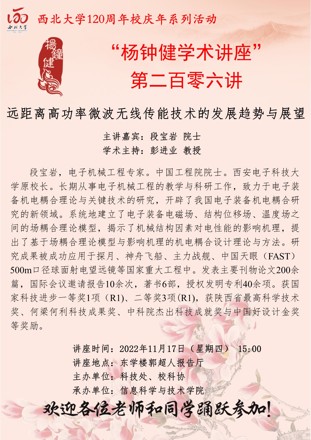 段宝岩 院士 “杨钟健学术讲座”第二百零六讲暨120周年校庆年系列活动:远距离高功率微波无线传能技术的发展趋势与展望 讲座时间 2022年11月17日(星期四)15:00 讲座地点 长安校区东学楼郭超人报告厅 讲座人介绍 段宝岩 院士 讲座内容