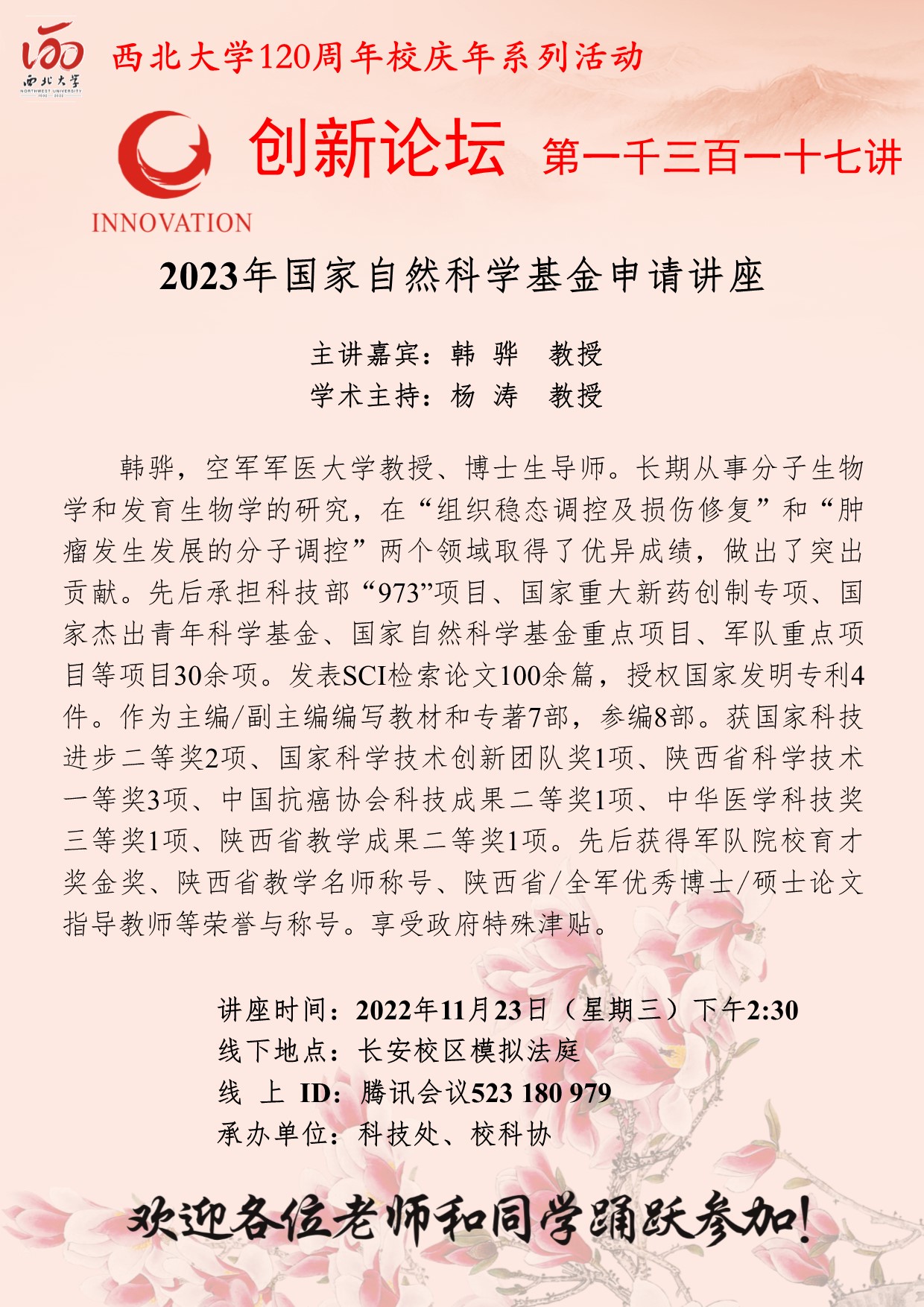 韩骅 教授 乐鱼网页版页面登录创新论坛第一千三百一十七讲暨120周年校庆年系列活动:2023年国家自然科学基金申请讲座 讲座时间 2022年11月23日(星期三)下午2:30 讲座地点 长安校区模拟法庭 讲座人介绍 韩骅 教授 讲座内容