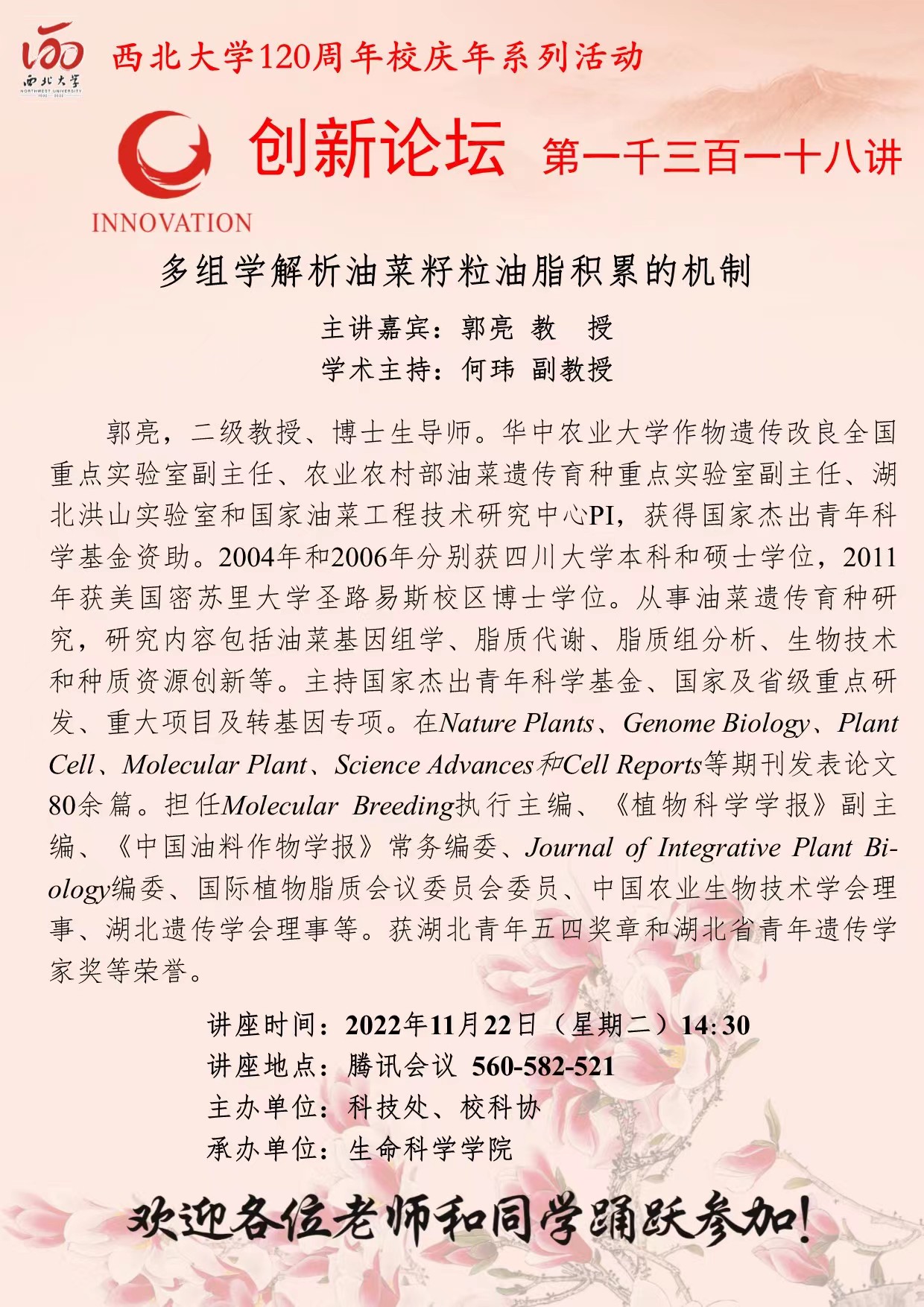 郭亮 教授 乐鱼网页版页面登录创新论坛第一千三百一十八讲暨120周年校庆年系列活动: 多组学解析油菜籽粒油脂积累的机制 讲座时间 2022年11月22日(星期二) 14:30 讲座地点 腾讯会议 560-582-521 讲座人介绍 郭亮 教授 讲座内容
