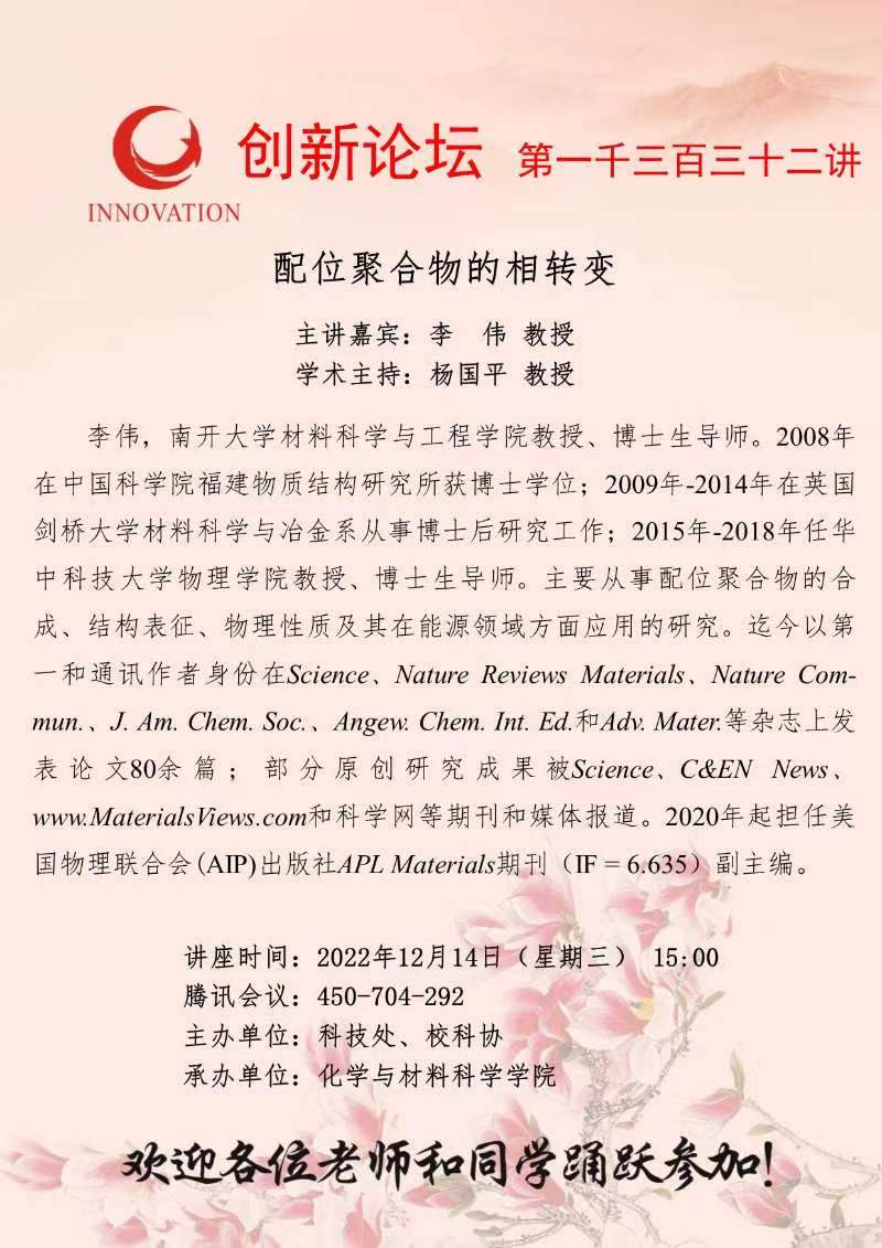 李伟 教授 乐鱼网页版页面登录创新论坛第一千三百三十二讲:配位聚合物的相转变 讲座时间 2022年12月14日(星期三) 15:00 讲座地点 腾讯会议:450-704-292 讲座人介绍 李伟 教授 讲座内容