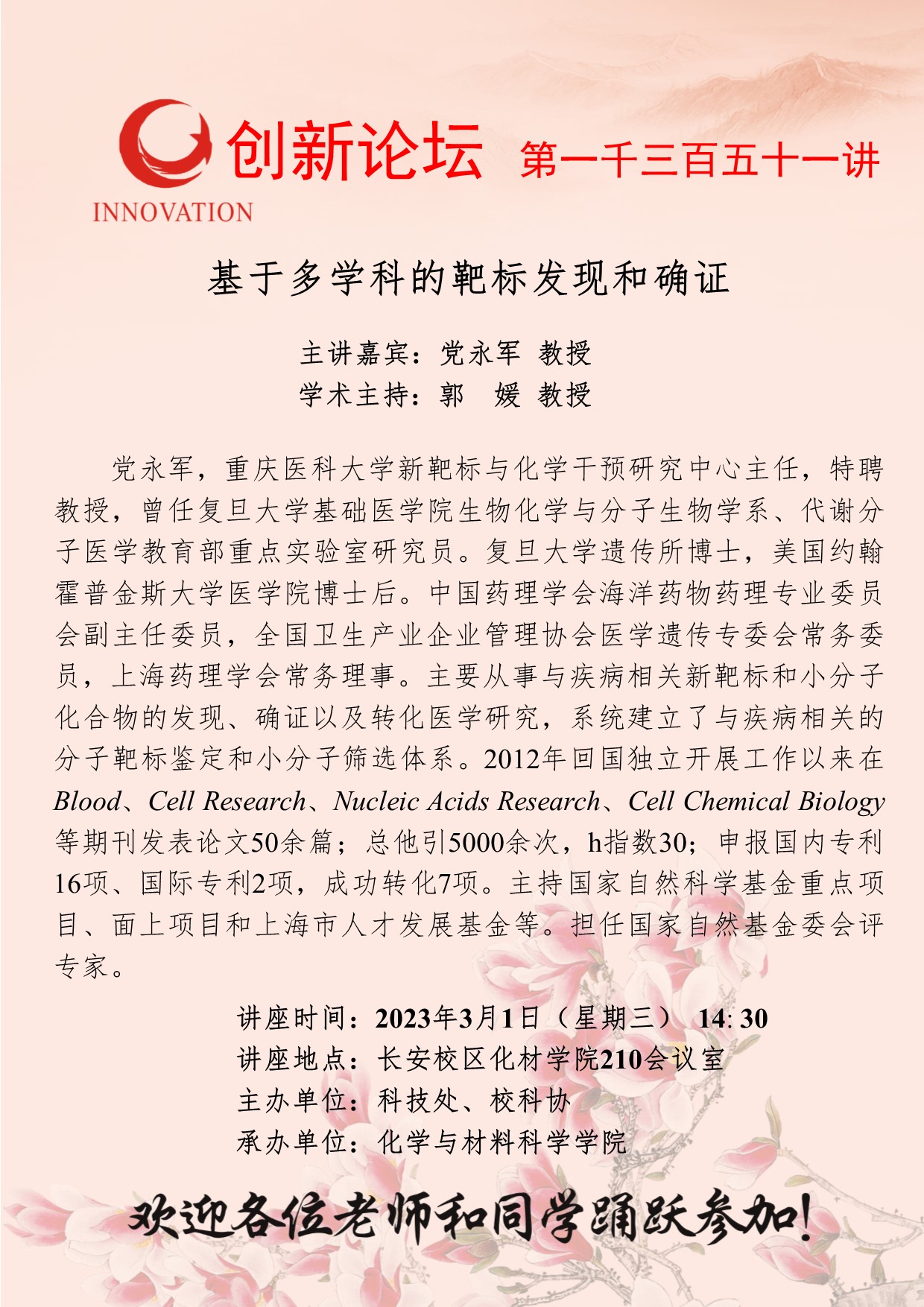党永军 教授 乐鱼网页版页面登录创新论坛第一千三百五十一讲:基于多学科的靶标发现和确证 讲座时间 2023年3月1日(星期三) 14: 30 讲座地点 长安校区化材学院210会议室 讲座人介绍 党永军 教授 讲座内容