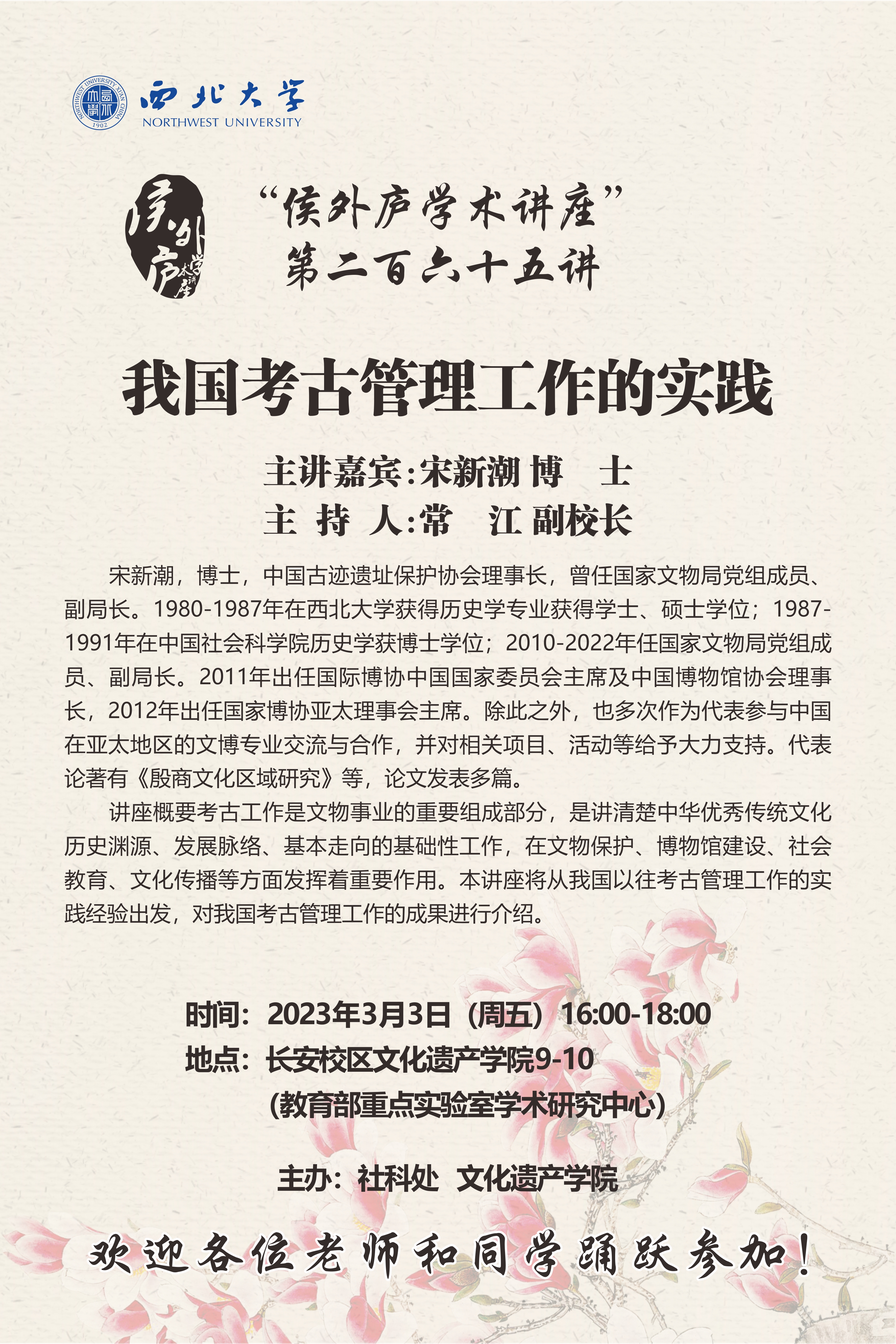宋新潮 博士 侯外庐学术讲座第二百六十五讲:我国考古管理工作的实践 讲座时间 2022年3月3日(周五)16:00-18:00 讲座地点 长安校区文化遗产学院9-10室 讲座人介绍 宋新潮 博士 讲座内容