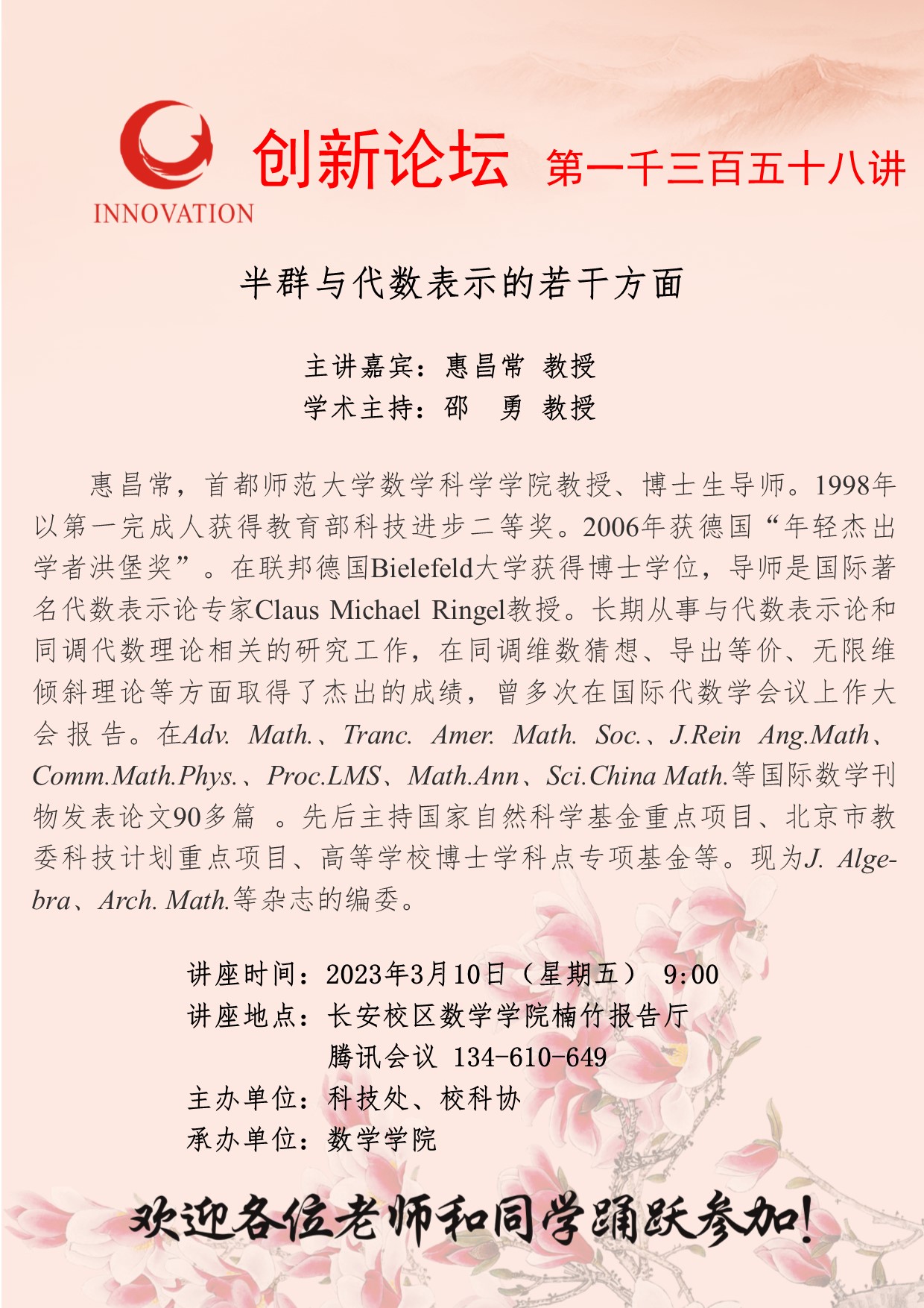 惠昌常 教授 乐鱼网页版页面登录创新论坛第一千三百五十八讲:半群与代数表示的若干方面 讲座时间 2023年3月10日(星期五) 9:00 讲座地点 长安校区数学学院楠竹报告厅、腾讯会议134-610-649 讲座人介绍 惠昌常 教授 讲座内容
