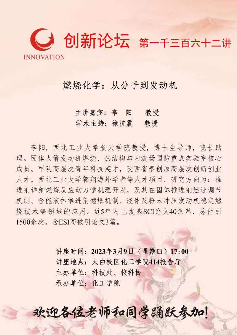 李阳 教授 乐鱼网页版页面登录创新论坛第一千三百六十二讲:燃烧化学:从分子到发动机 讲座时间 2023年3月9日(星期四)17:00 讲座地点 太白校区化工学院414报告厅 讲座人介绍 李阳 教授 讲座内容