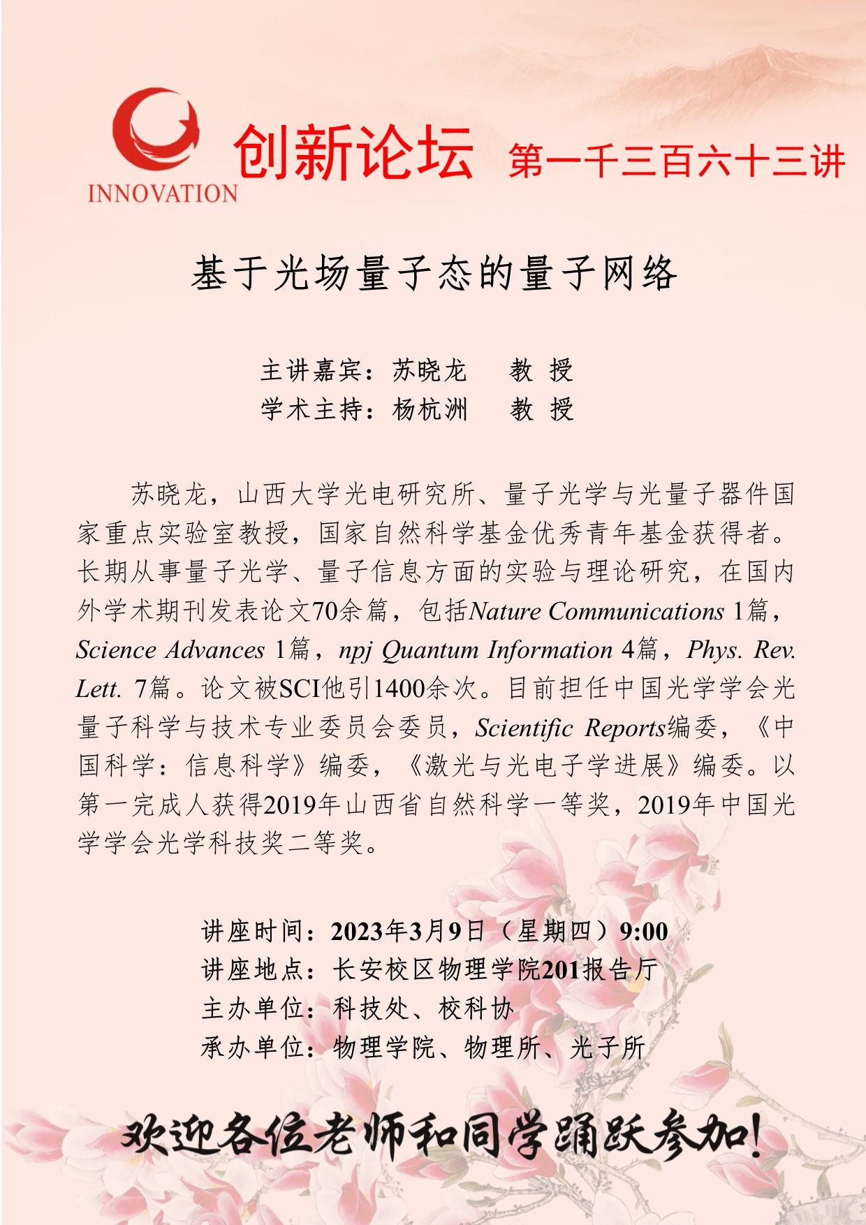 苏晓龙 教授 乐鱼网页版页面登录创新论坛第一千三百六十三讲:基于光场量子态的量子网络 讲座时间 2023年3月9日(星期四)9:00 讲座地点 长安校区物理学院201报告厅 讲座人介绍 苏晓龙 教授 讲座内容