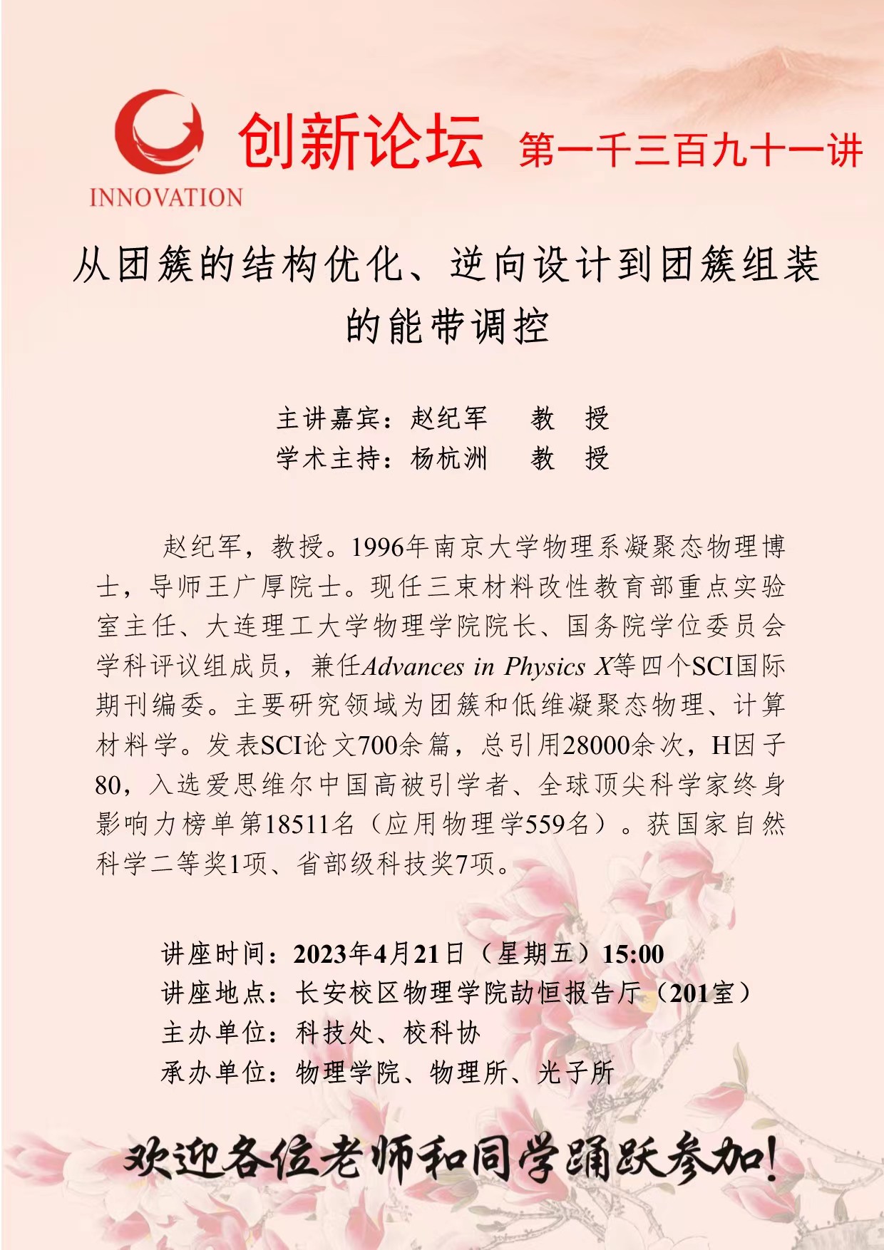 赵纪军 教 授 乐鱼网页版页面登录创新论坛第一千三百九十一讲:从团簇的结构优化、逆向设计到团簇组装的能带调控 讲座时间 2023年4月21日(星期五)15:00 讲座地点 长安校区物理学院劼恒报告厅(201室) 讲座人介绍 赵纪军 教 授 讲座内容