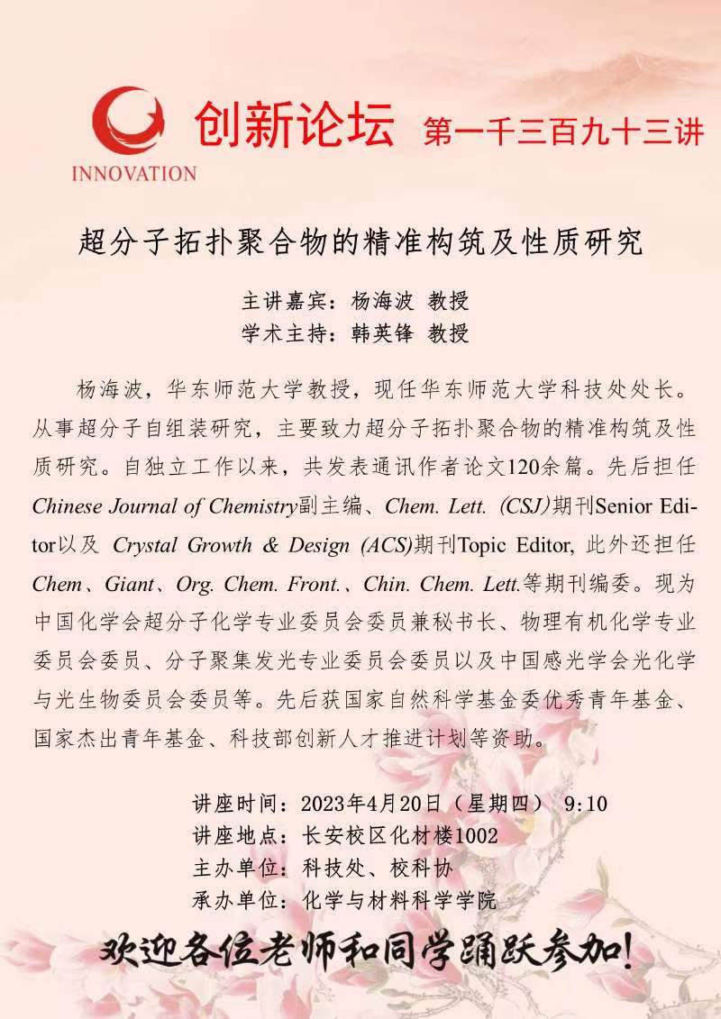 杨海波 教授 乐鱼网页版页面登录创新论坛第一千三百九十三讲:超分子拓扑聚合物的精准构筑及性质研究 讲座时间 2023年4月20日(星期四) 9:10 讲座地点 长安校区化材楼1002 讲座人介绍 杨海波 教授 讲座内容