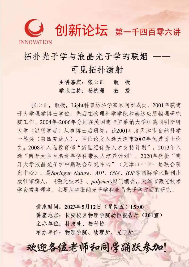 张心正 教 授 乐鱼网页版页面登录创新论坛第一千四百零六讲:拓扑光子学与液晶光子学的联姻 — 可见拓扑激射 讲座时间 2023年5月12日(星期五)15:00 讲座地点 长安校区物理学院劼恒报告厅(201室) 讲座人介绍 张心正 教 授 讲座内容