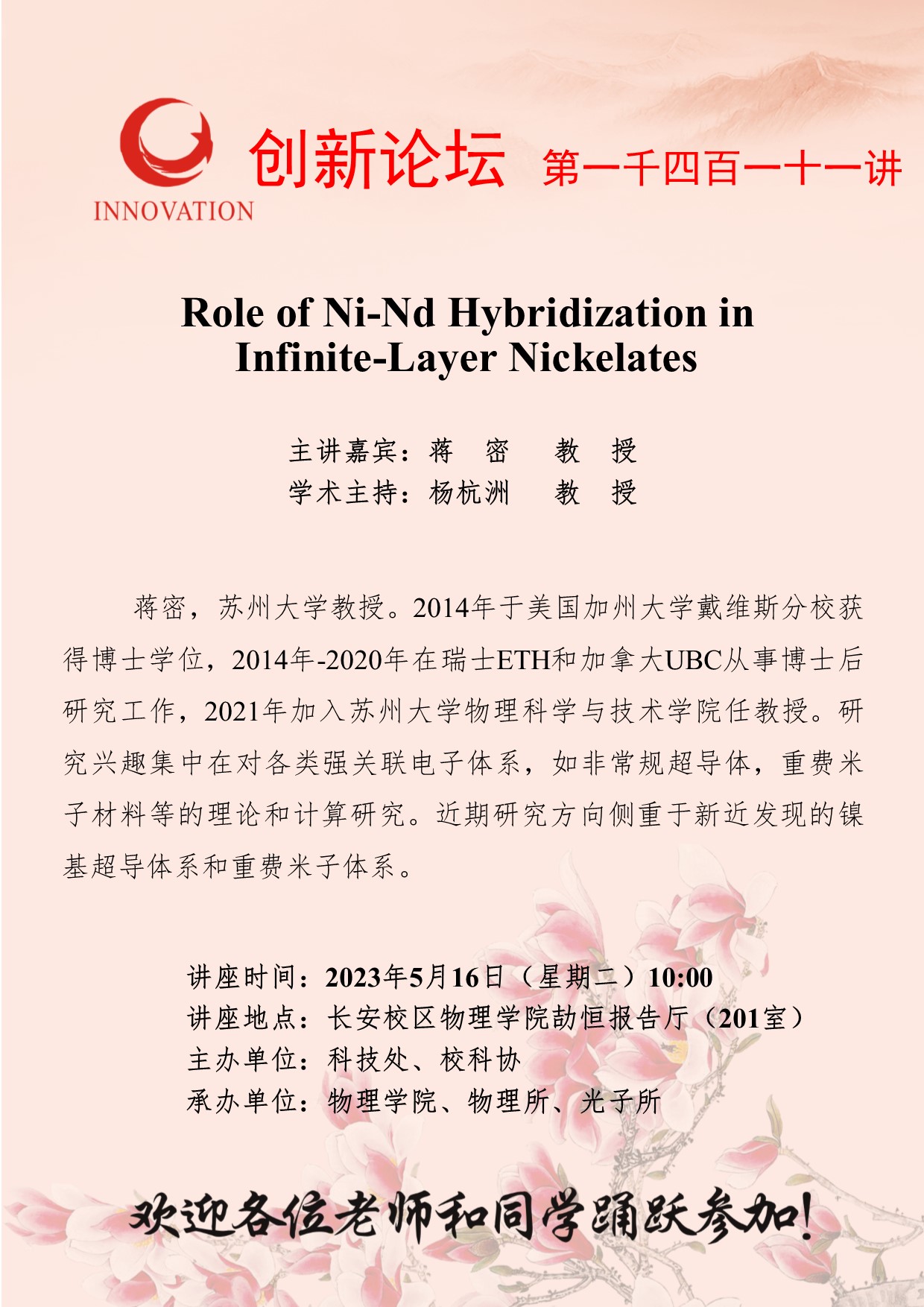 蒋密 教授 乐鱼网页版页面登录创新论坛第一千四百一十一讲:Role of Ni-Nd Hybridization in Infinite-Layer Nickelates 讲座时间 2023年5月16日(星期二)10:00 讲座地点 长安校区物理学院劼恒报告厅(201室) 讲座人介绍 蒋密 教授 讲座内容