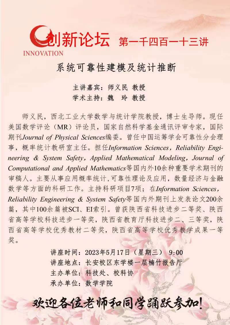 师义民 教授 乐鱼网页版页面登录创新论坛第一千四百一十三讲:系统可靠性建模及统计推断 讲座时间 2023年5月17日(星期三) 9:00 讲座地点 长安校区东学楼一层楠竹报告厅 讲座人介绍 师义民 教授 讲座内容