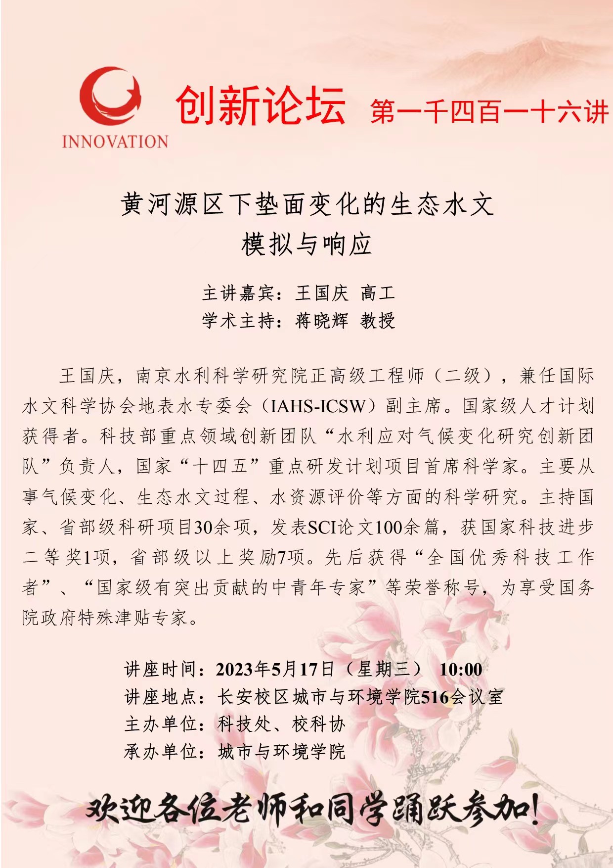 王国庆 高工 乐鱼网页版页面登录创新论坛第一千四百一十六讲:黄河源区下垫面变化的生态水文模拟与响应 讲座时间 2023年5月17日(星期三) 10:00 讲座地点 长安校区城市与环境学院516会议室 讲座人介绍 王国庆 高工 讲座内容
