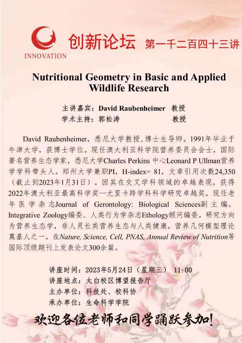 David Raubenheimer 教授 乐鱼网页版页面登录创新论坛第一千四百二十四讲:Nutritional Geometry in Basic and Applied Wildlife Research 讲座时间 2023年5月24日(星期三)11:00 讲座地点 太白校区博望报告厅 讲座人介绍 David Raubenheimer 教授 讲座内容
