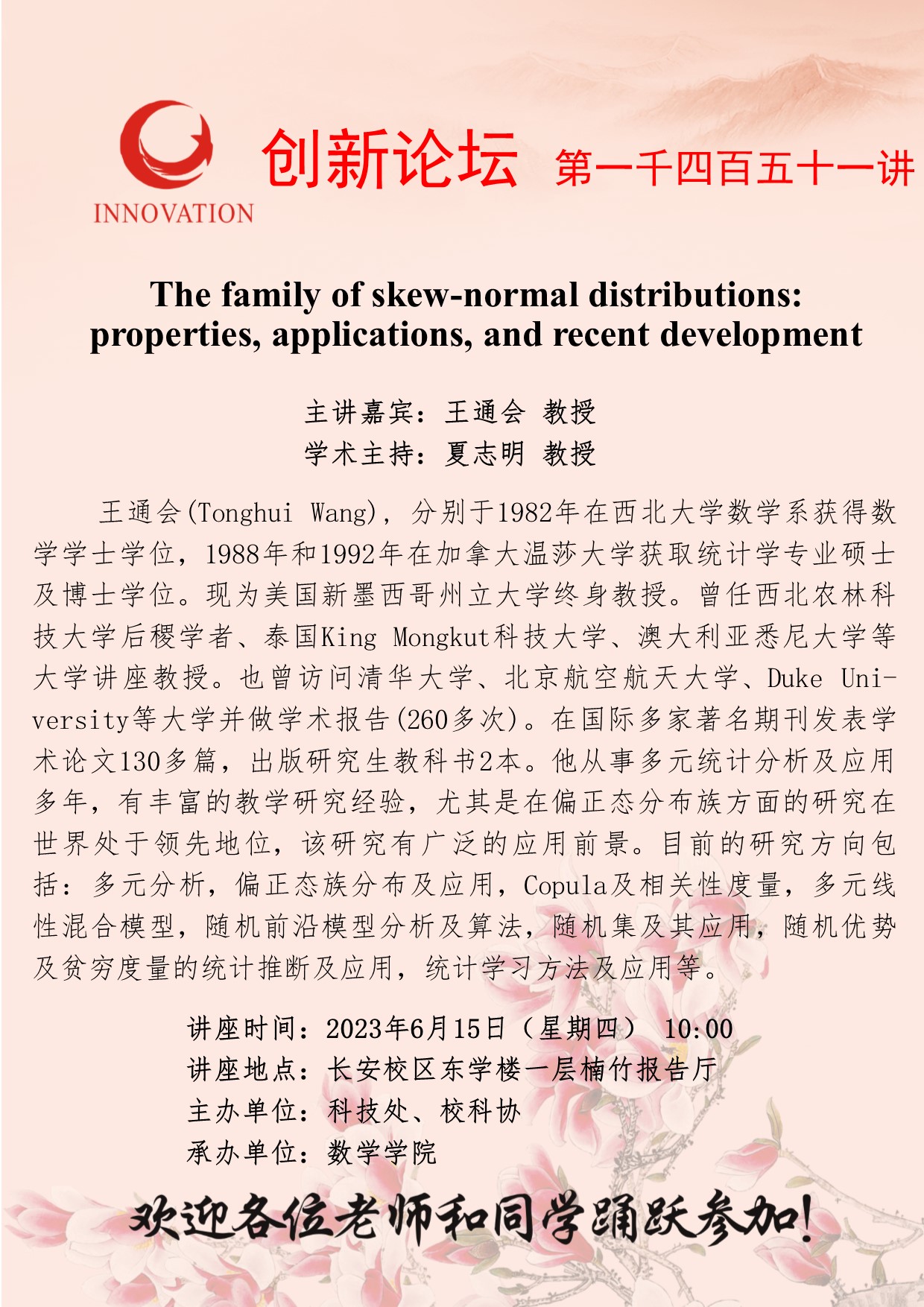 王通会 教授 乐鱼网页版页面登录创新论坛第一千四百五十一讲:The family of skew-normal distributions: properties, applications, and recent development 讲座时间 2023年6月15日(星期四) 10:00 讲座地点 长安校区东学楼一层楠竹报告厅 讲座人介绍 王通会 教授 讲座内容