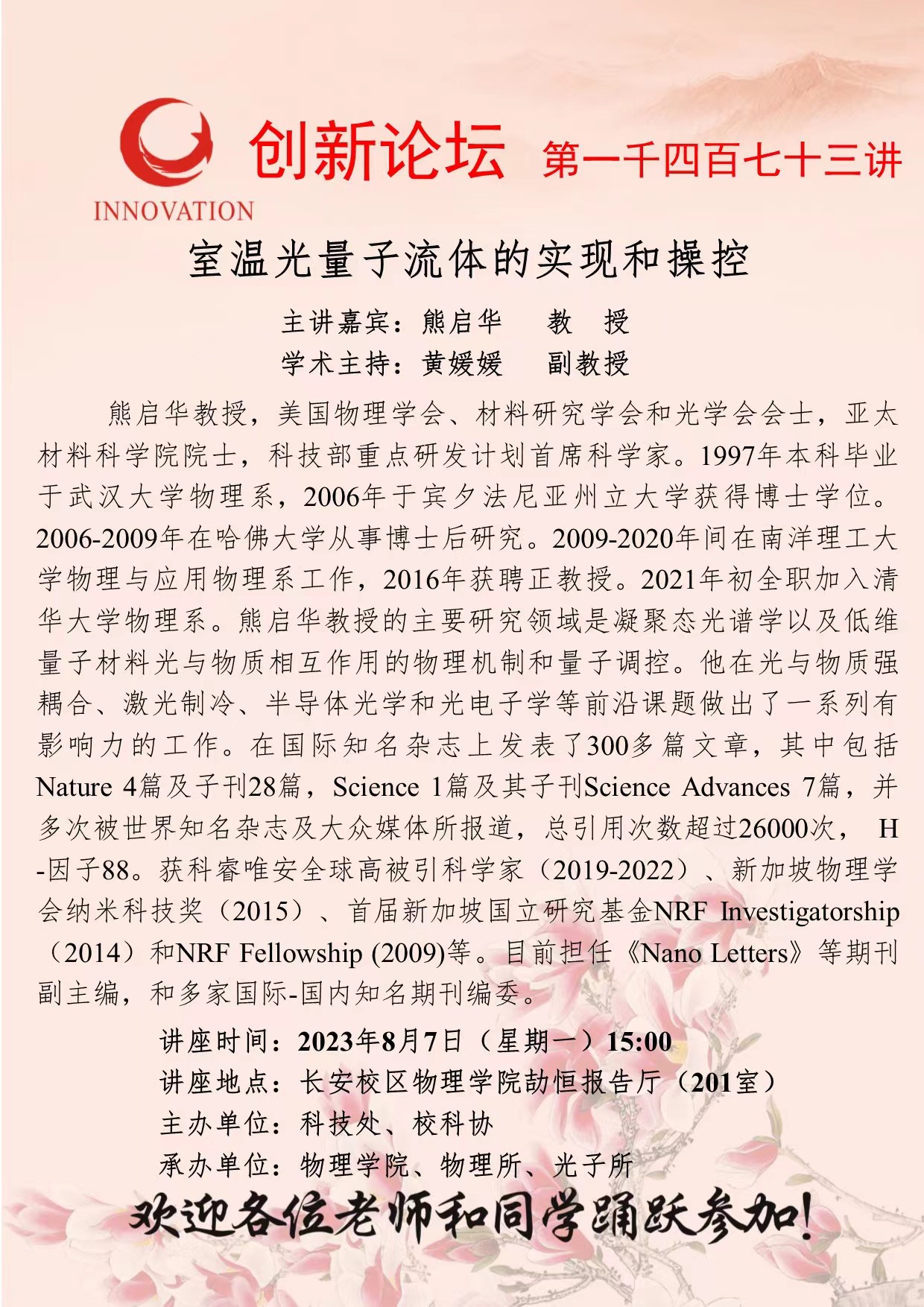 熊启华 教授 乐鱼网页版页面登录创新论坛第一千四百七十三讲:温室光量子流体的实现和操控 讲座时间 2023年8月7日(星期一)15:00 讲座地点 长安校区物理学院劼恒报告厅 讲座人介绍 熊启华 教授 讲座内容