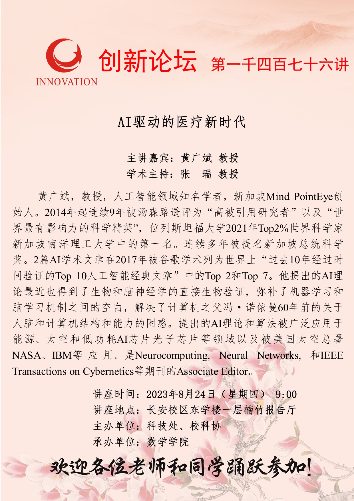 黄广斌 教授 乐鱼网页版页面登录创新论坛第一千四百七十六讲:超限学习机和深度学习的汇聚: 智能科学体系统一性理论原理 讲座时间 2023年8月24日(星期四) 9:00 讲座地点 长安校区东学楼一层楠竹报告厅 讲座人介绍 黄广斌 教授 讲座内容