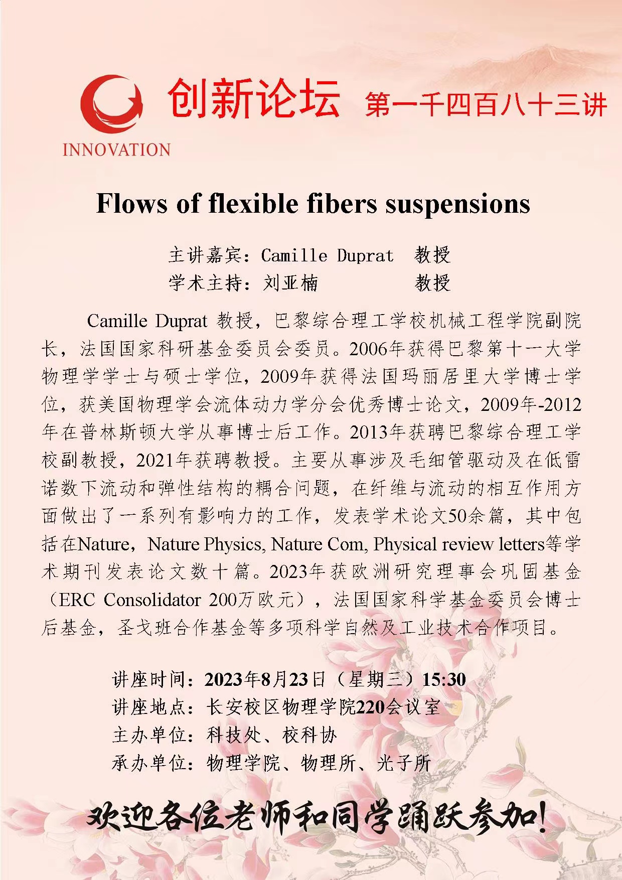 Camille Duprat 教授 乐鱼网页版页面登录创新论坛第一千四百八十三讲:Flows of flexible fibers suspensions 讲座时间 2023年8月23日(星期三) 15:30 讲座地点 长安校区物理学院220会议室 讲座人介绍 Camille Duprat 教授 讲座内容