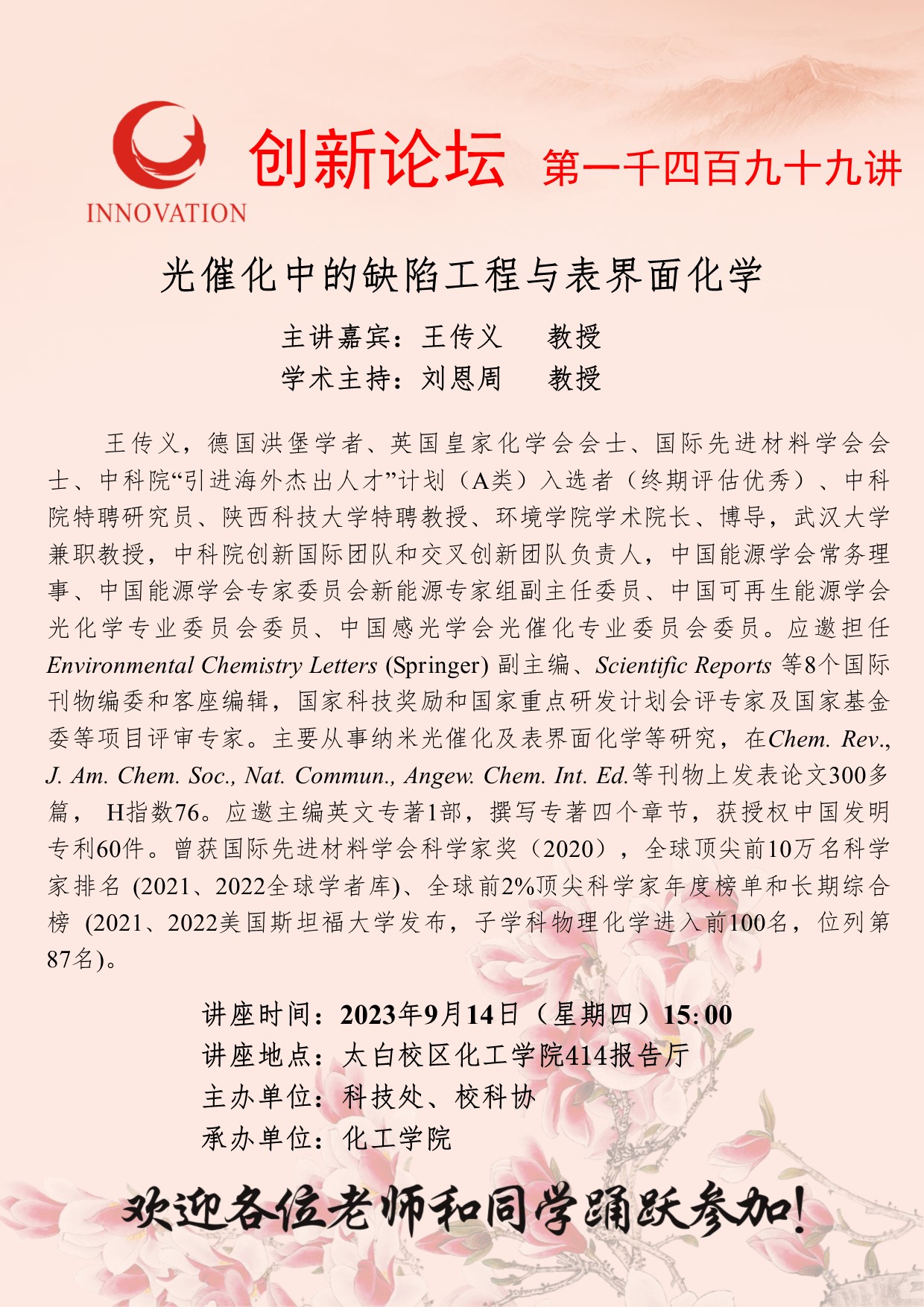王传义 教授 乐鱼网页版页面登录创新论坛第一千四百九十九讲:光催化中的缺陷工程与表界面化学 讲座时间 2023年9月14日(星期四)15:00 讲座地点 太白校区化工学院414报告厅 讲座人介绍 王传义 教授 讲座内容