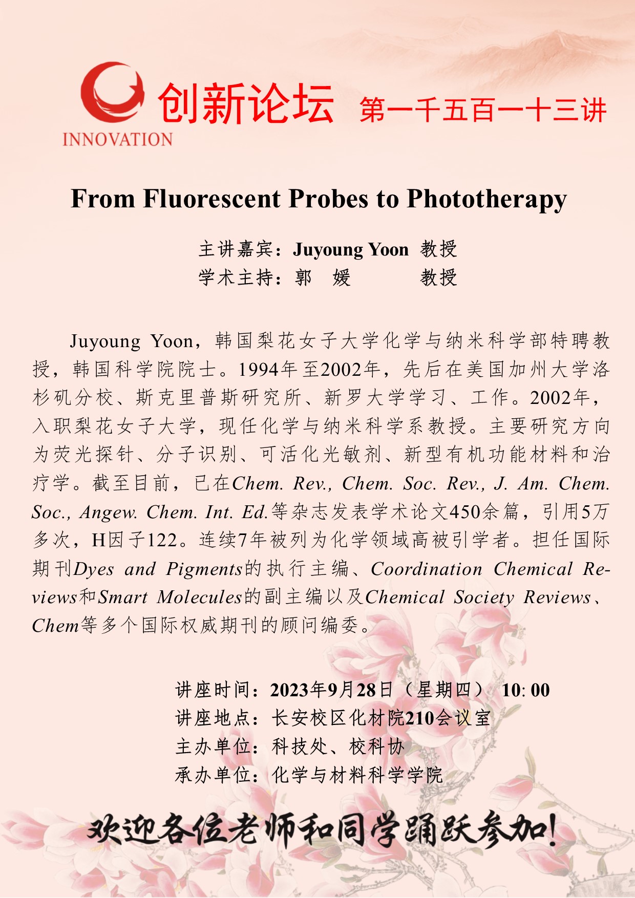 Juyoung Yoon 教授 乐鱼网页版页面登录创新论坛第一千五百一十三讲:From Fluorescent Probes to Phototherapy 讲座时间 2023年9月28日(星期四) 10: 00 讲座地点 长安校区化材院210会议室 讲座人介绍 Juyoung Yoon 教授 讲座内容