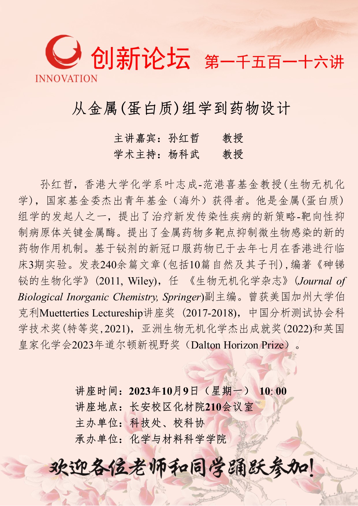 孙红哲 教授 乐鱼网页版页面登录创新论坛第一千五百一十六讲:从金属(蛋白质)组学到药物设计 讲座时间 2023年10月9日(星期一) 10: 00 讲座地点 长安校区化材院210会议室 讲座人介绍 孙红哲 教授 讲座内容