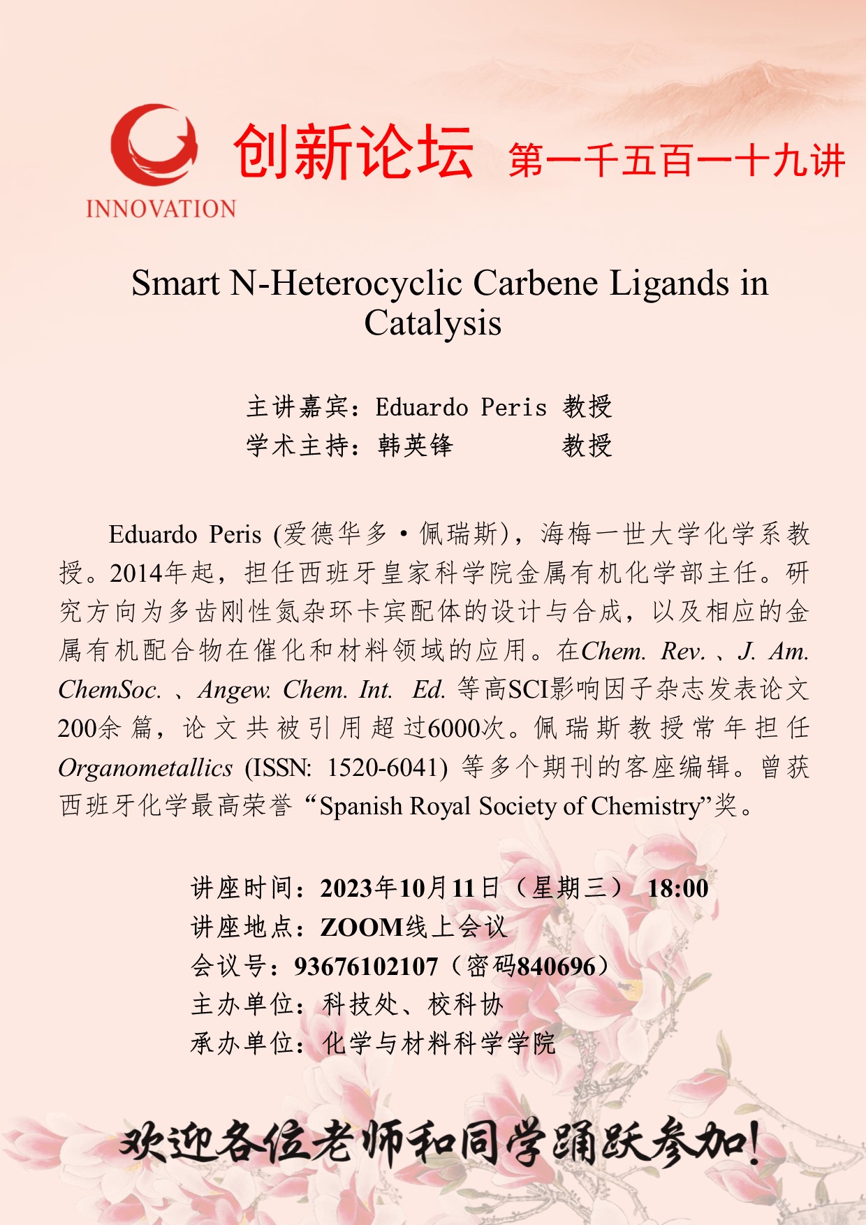 Eduardo Peris 教授 乐鱼网页版页面登录创新论坛第一千五百一十九讲: Smart N-Heterocyclic Carbene Ligands in Catalysis 讲座时间 2023年10月11日(星期三) 18:00 讲座地点 ZOOM线上会议 讲座人介绍 Eduardo Peris 教授 讲座内容